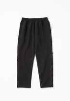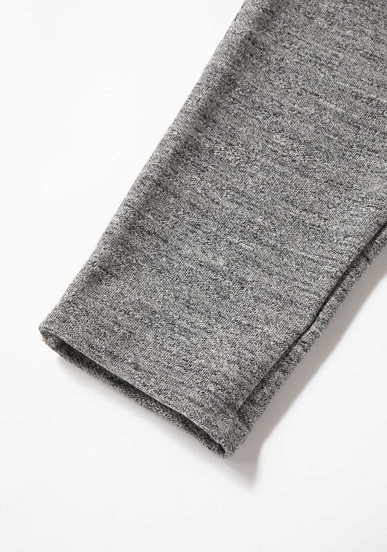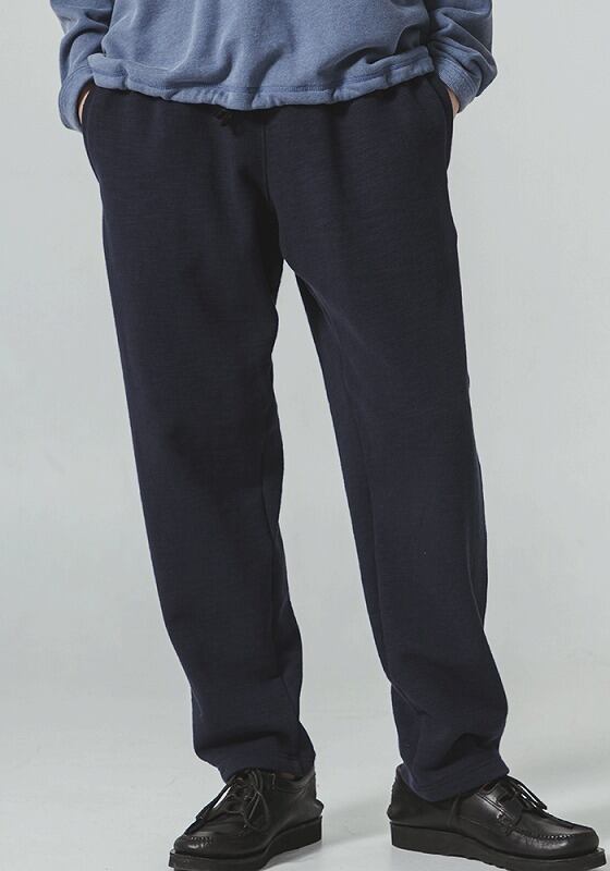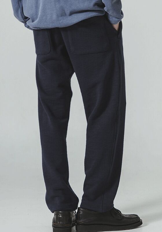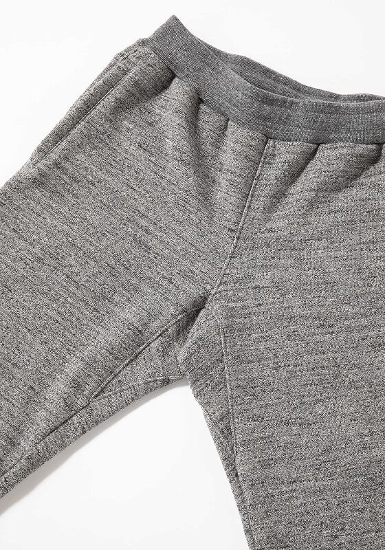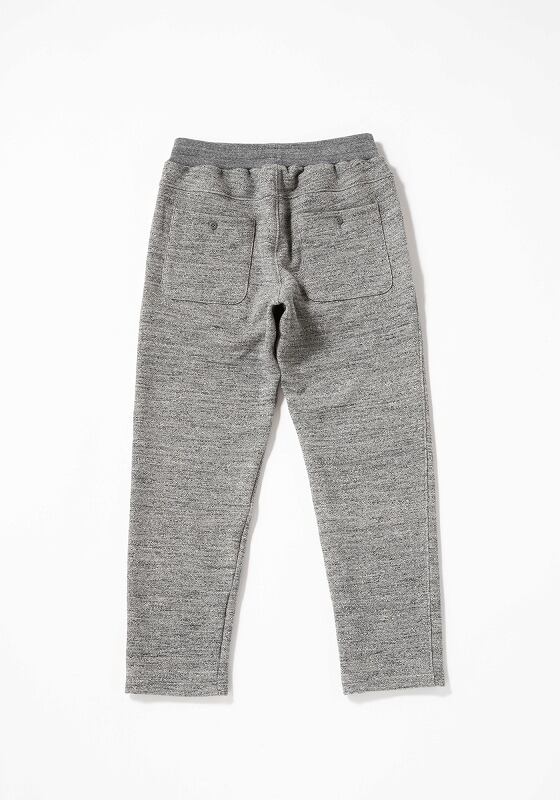 太番手の国産糸を使用し日本国内で編み立てたGG(ガラガラ)裏毛素材のスウエットペグトップパンツです。強い粗挽きの表情が特徴的な杢カラーは太さが異なる3種の糸の濃度を変えることで表現しました。設計はスウェットパンツの原型を踏襲しつつウエストはリブ仕様でインナーの収まりもよく、ポケットはファスナー付きで機能性をアップ。ヒップ周りや太もも周りはゆったりとしながらも膝から裾にかけてきつめにテーパーをかけすっきり見えるGGスウェットパンツの新しい形としてリリースします。