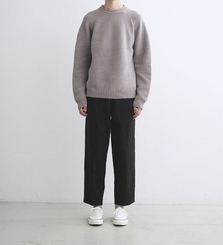 ネックラインは、あえてリブを高めに設定したクルーネックデザインで、首元に立体感が生まれ、大人らしい印象に。