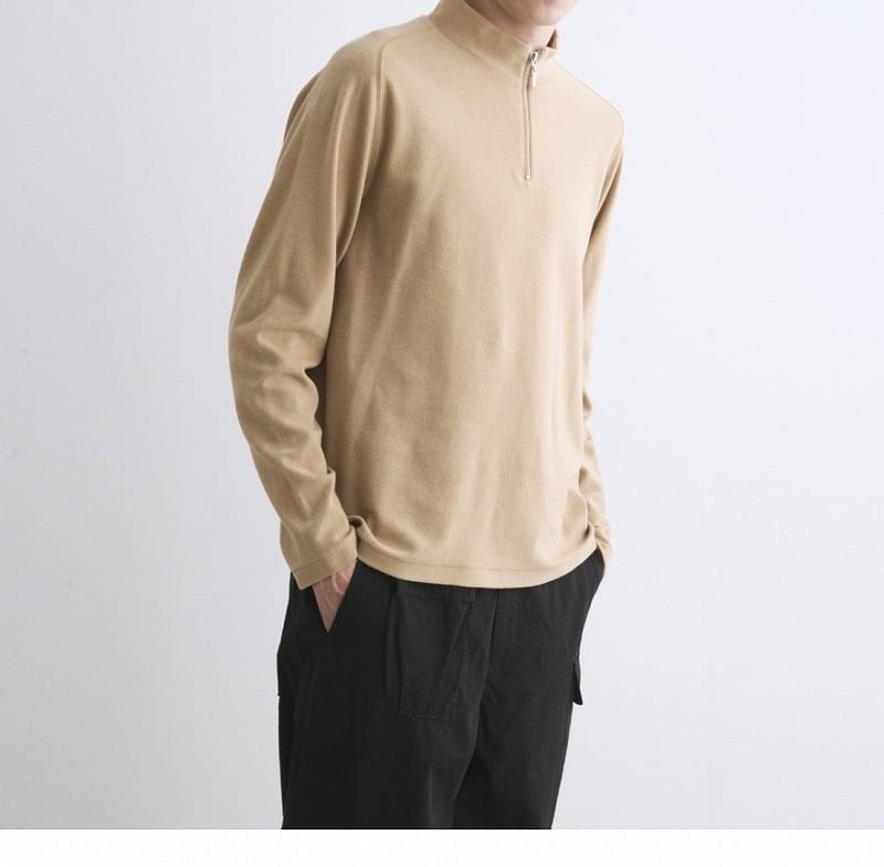 ハーフジップデザインにより、首元の開け閉めで印象を変えた着こなしも可能です。