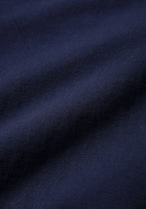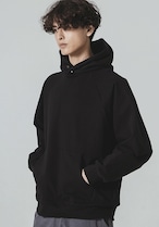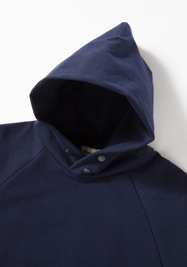 ストレッチ天竺素材に使用しているカバーリングヤーンを使用したストレッチミニ裏毛パーカです。カバーリングヤーン(ポリウレタン糸を芯に周りを綿糸でカバー)を表糸、中糸に使用、裏糸には肌触りの良いスーピマ糸を使用して28Gで編立て、度目が詰まりハリ感とモチモチとしたストレッチ性がある素材です。デザインはクラシカルなアスレティックウエアのような直線的なラグラン切り替えに寒さを凌ぐボタンで持ち上がる首元仕様が特徴です。素材の持つストレッチ性を活かして袖口、裾のリブも共生地を使用、全体の雰囲気を整えました。