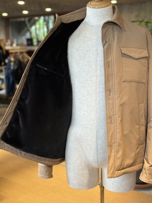 身頃の裏地には肌触りの良いエコファーを採用。快適な着心地はもちろんのこと、着用時に僅かに見えるファーが主張し過ぎず上品に映ります。
