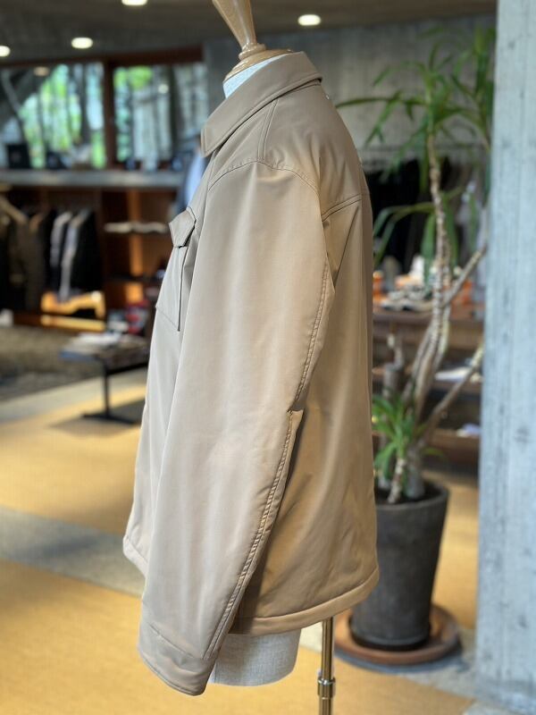 全体的に軽量で保温性のあるポリエステル中綿が配され、身頃にはエコファーも取り付けられたシャツ型ブルゾンです。モコモコしがちな要素がありながら、スッキリと洗練されたシルエットに仕上げられているのは、アウターを最も得意とする「HERNO(ヘルノ)」ならでは。
