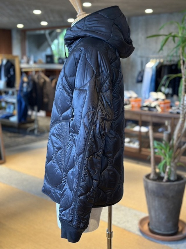 マイクロリップストップ・オペーク7デニール・キルティング・ナイロン製のフード付き中わたジャケット。生地の軽さと透け感が衣服の構造を強調している。C.P.カンパニーのアイコンであるレンズ、2WAYフルジップファスナー、サイドのフラップポケット、調節可能なフードが特徴。中わたには保温性と通気性に優れたプリマロフト®シルバーを使用。 レギュラーフィット。