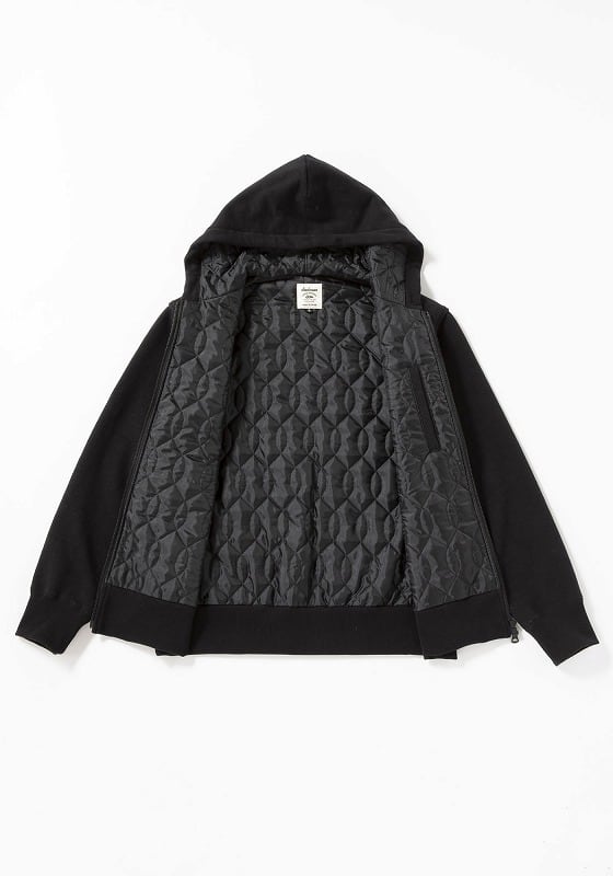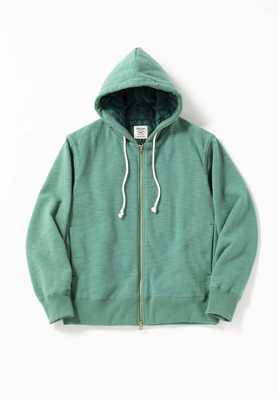 太番手の国産糸を使用し日本国内で編み立てたGG(ガラガラ)裏毛素材を表面に使用、裏側にはBall柄キルトを使用して保温性と軽さを追究したパデット仕様のスウェットパーカです。GG裏毛の伸縮性を妨げないよう、キルトは身頃部分だけに使用して袖部分は裏毛のままにしました。両サイドに配置したシームポケットは使いやすさを考え脇に切り替えを施し、アウターとしての着用も想定して左内ポケットも配しました。膨らみのあるリブ、窮屈さを感じないよう工夫した表裏の縫い代をずらしたフード先の見返し、波打ちのないきれいな身頃とリブの縫合部等、職人の技術が詰まった製品に仕上げました。