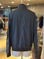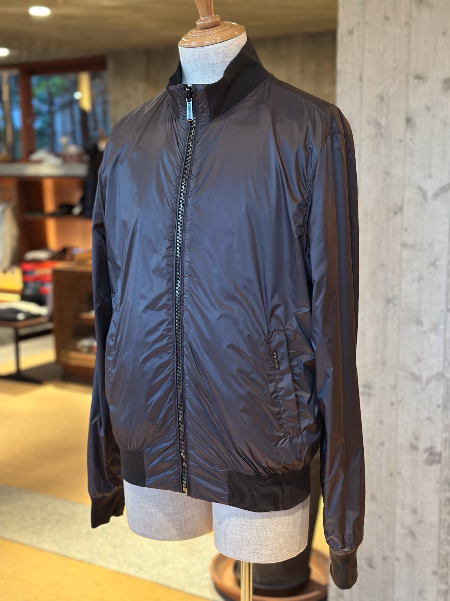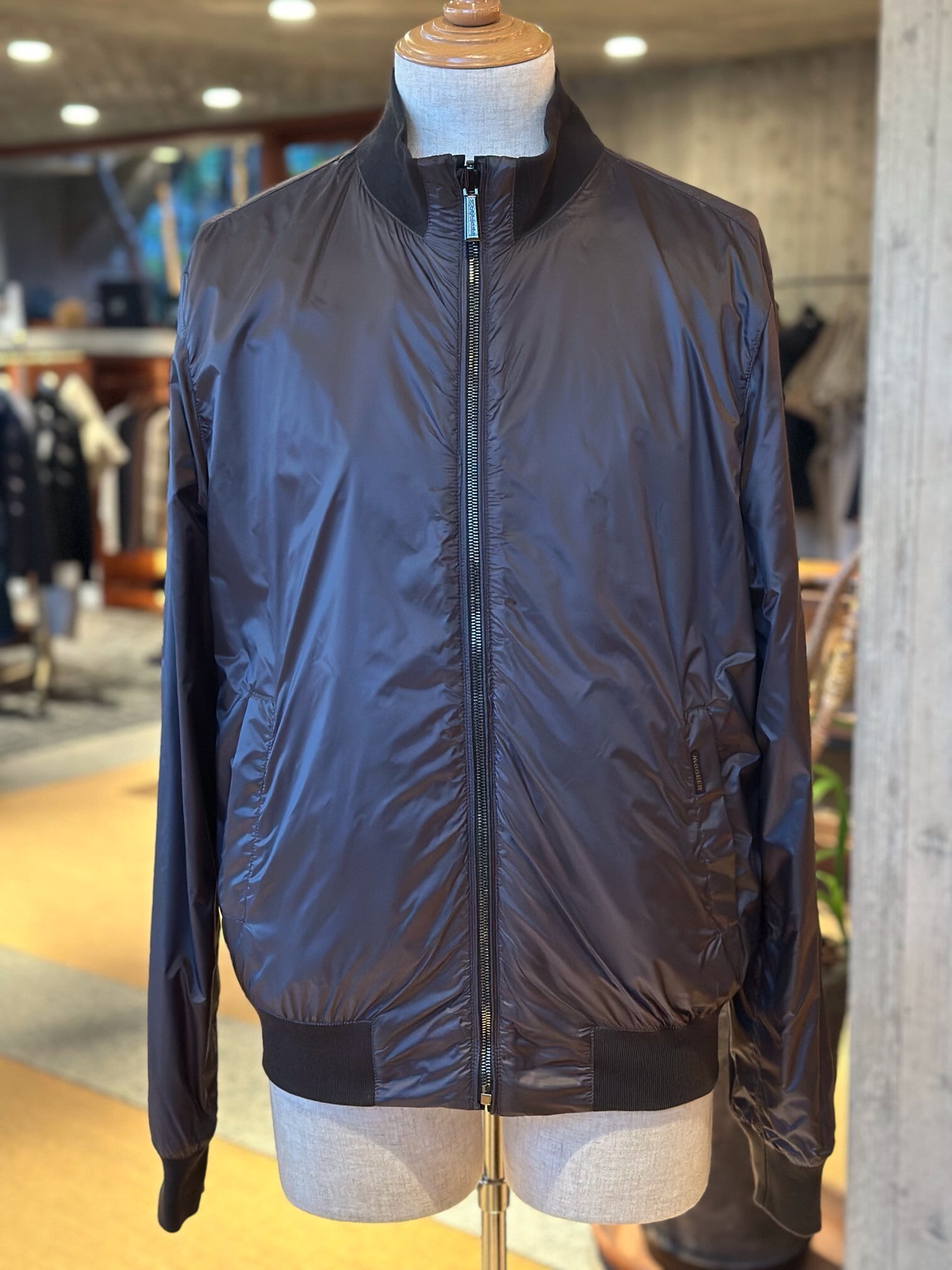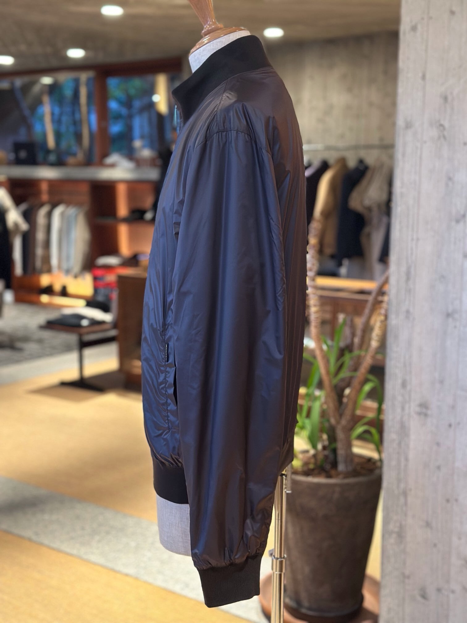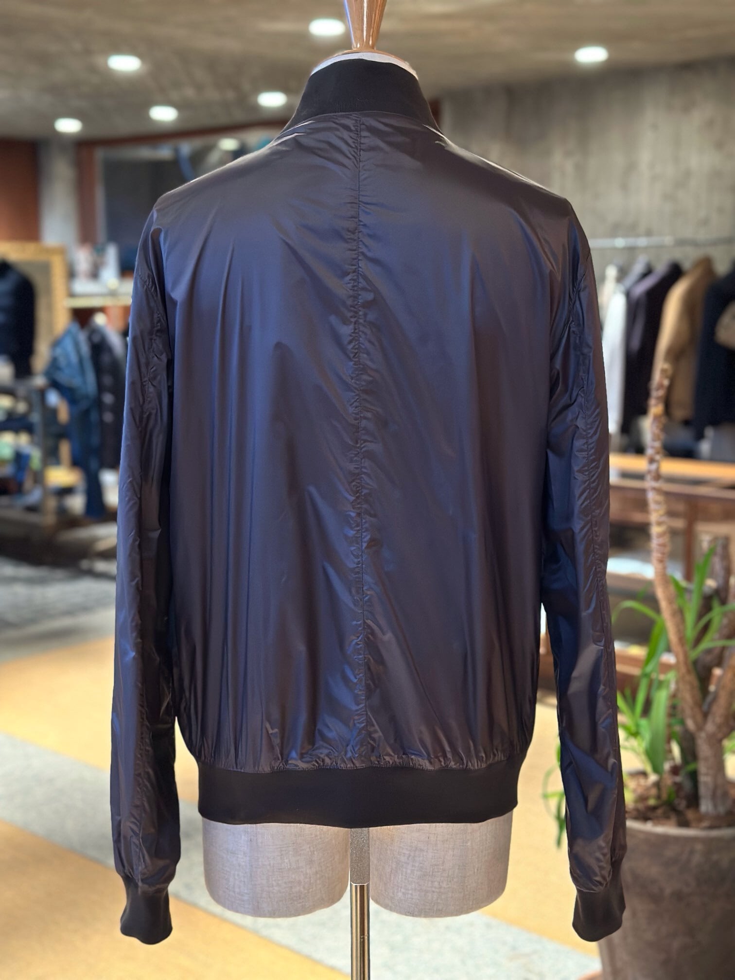 片面に「Sharp Memory Pes」ファブリック、もう片面に「Pirax」ファブリックを使用したリバーシブルのボンバージャケット。視点によって色が変化するタフタ織りのギャバジン生地は、形状記憶性能と耐水性を備えており、重ね染めがほどこされています。