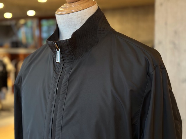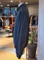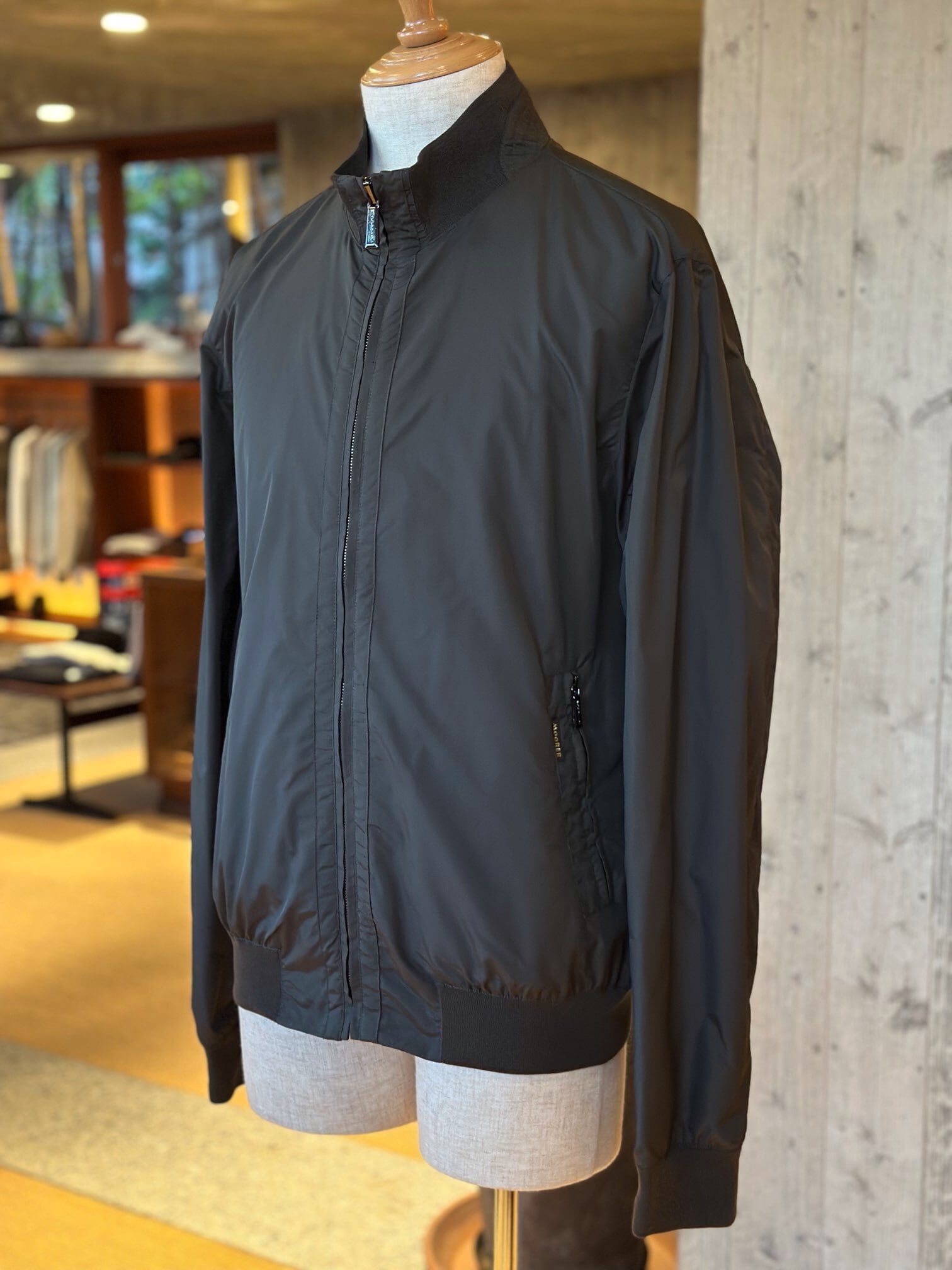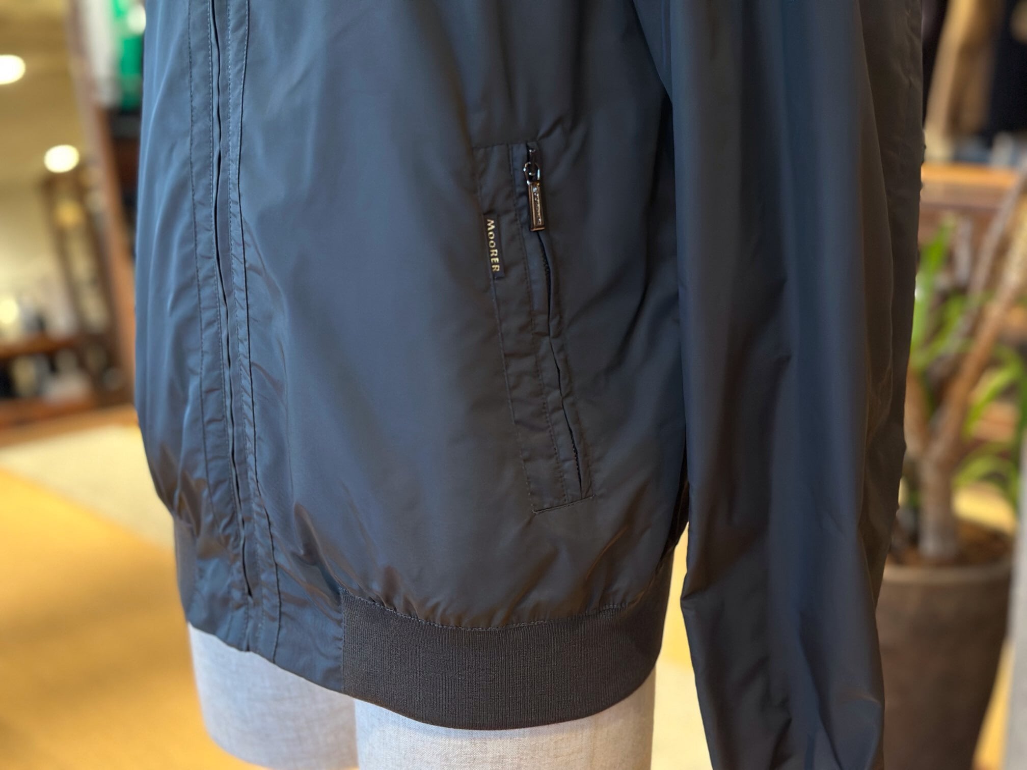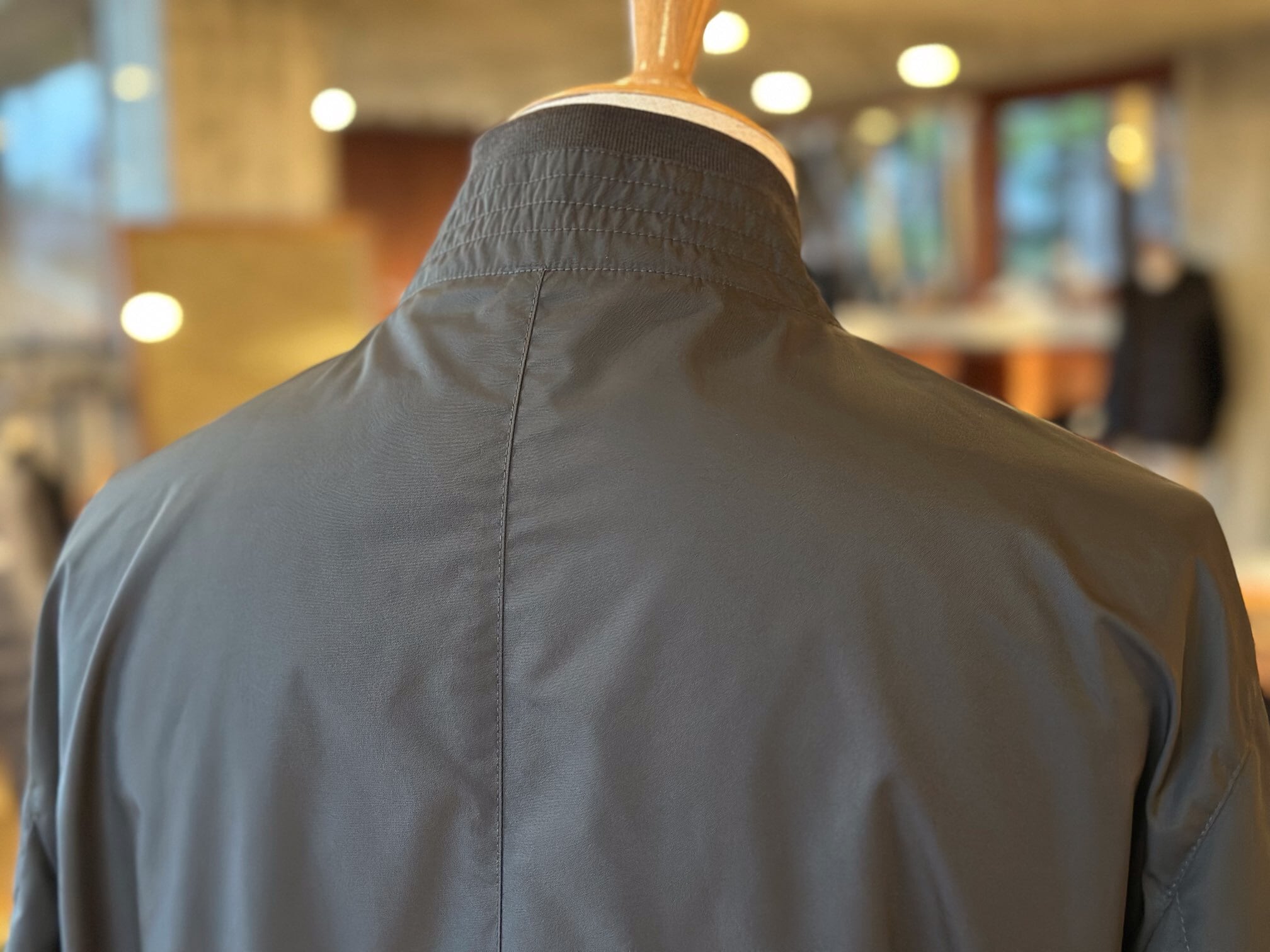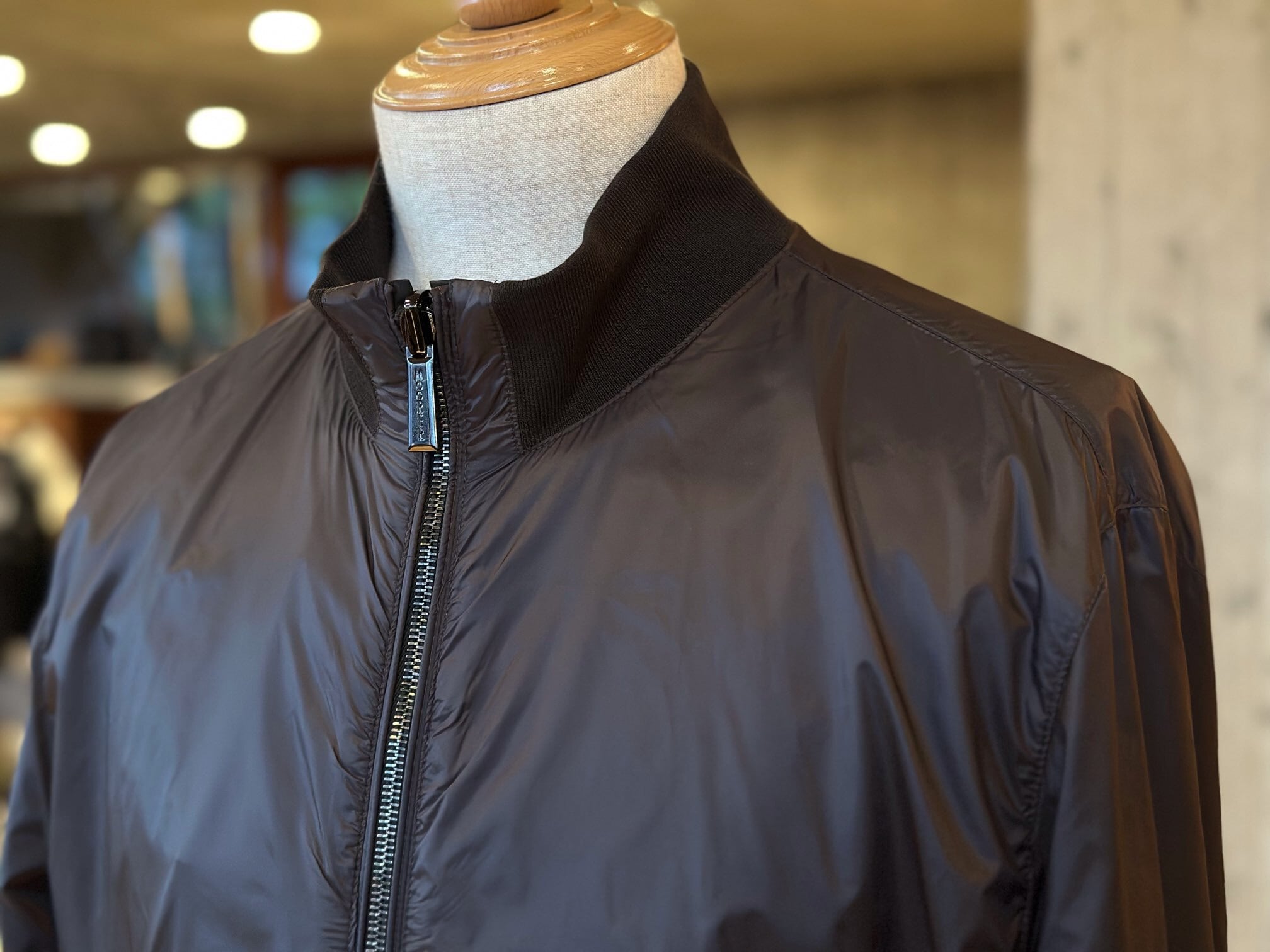 片面に「Sharp Memory Pes」ファブリック、もう片面に「Pirax」ファブリックを使用したリバーシブルのボンバージャケット。視点によって色が変化するタフタ織りのギャバジン生地は、形状記憶性能と耐水性を備えており、重ね染めがほどこされています。