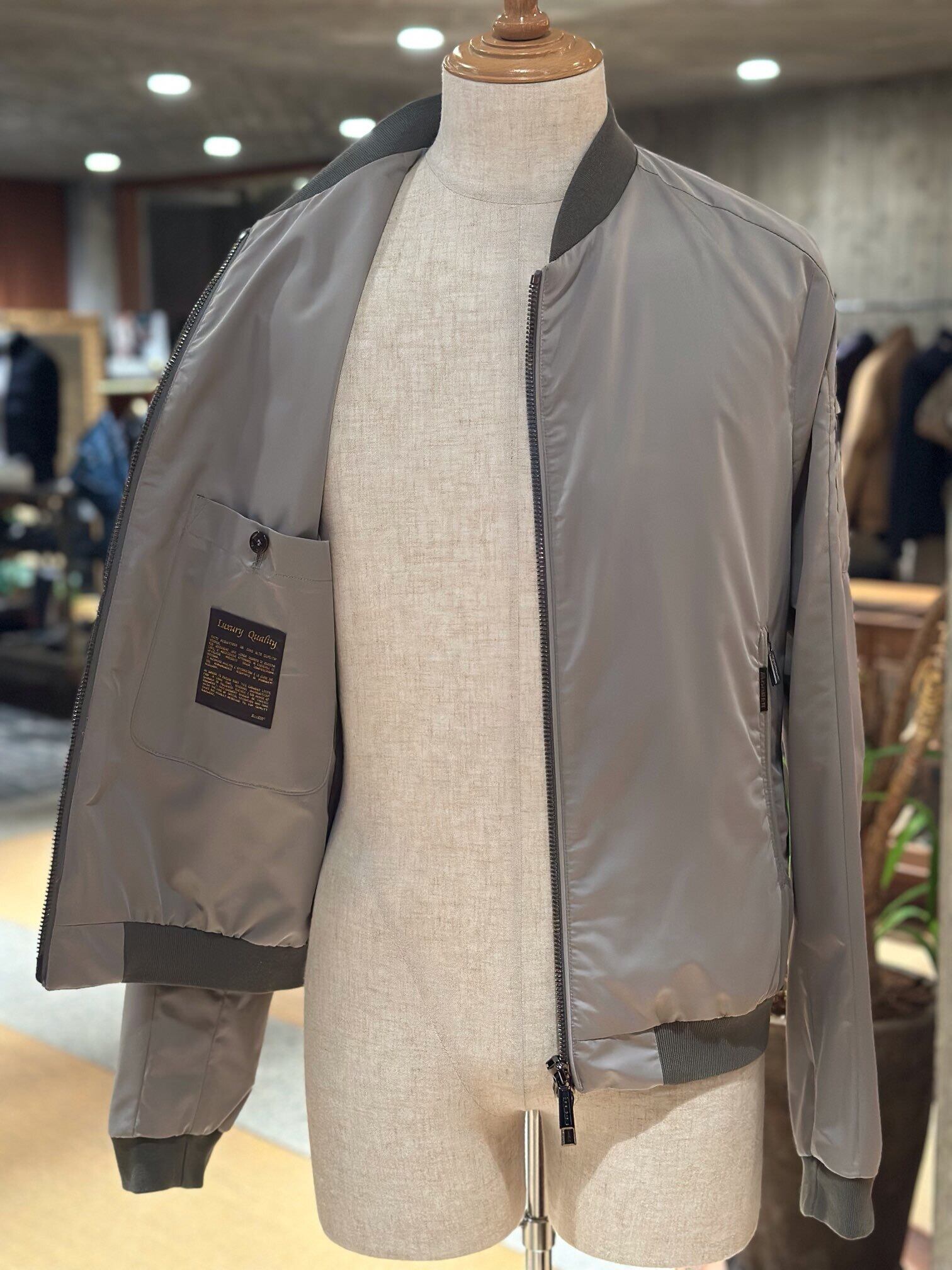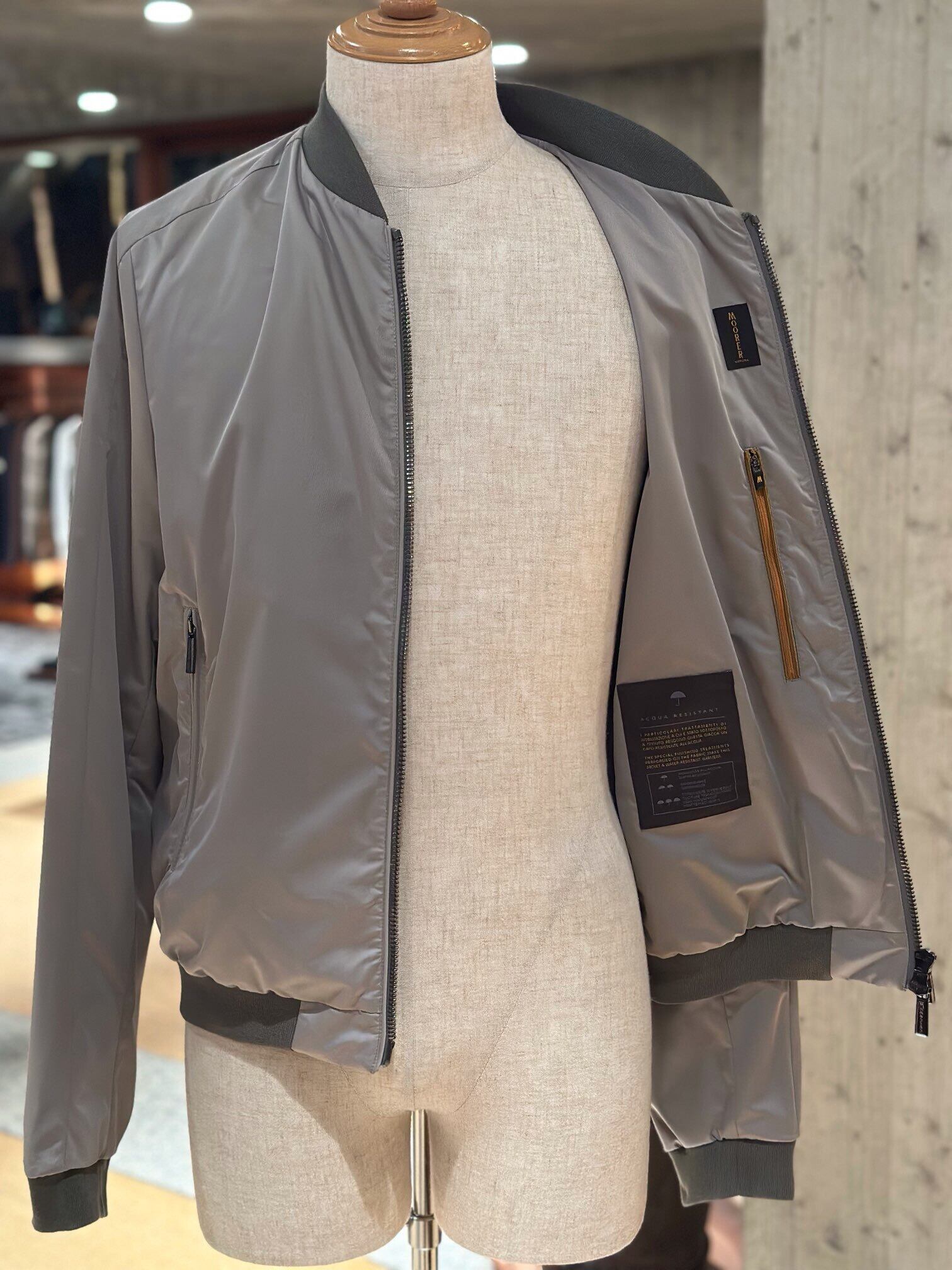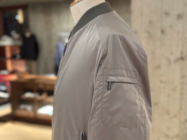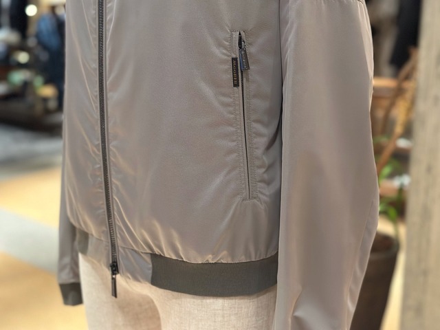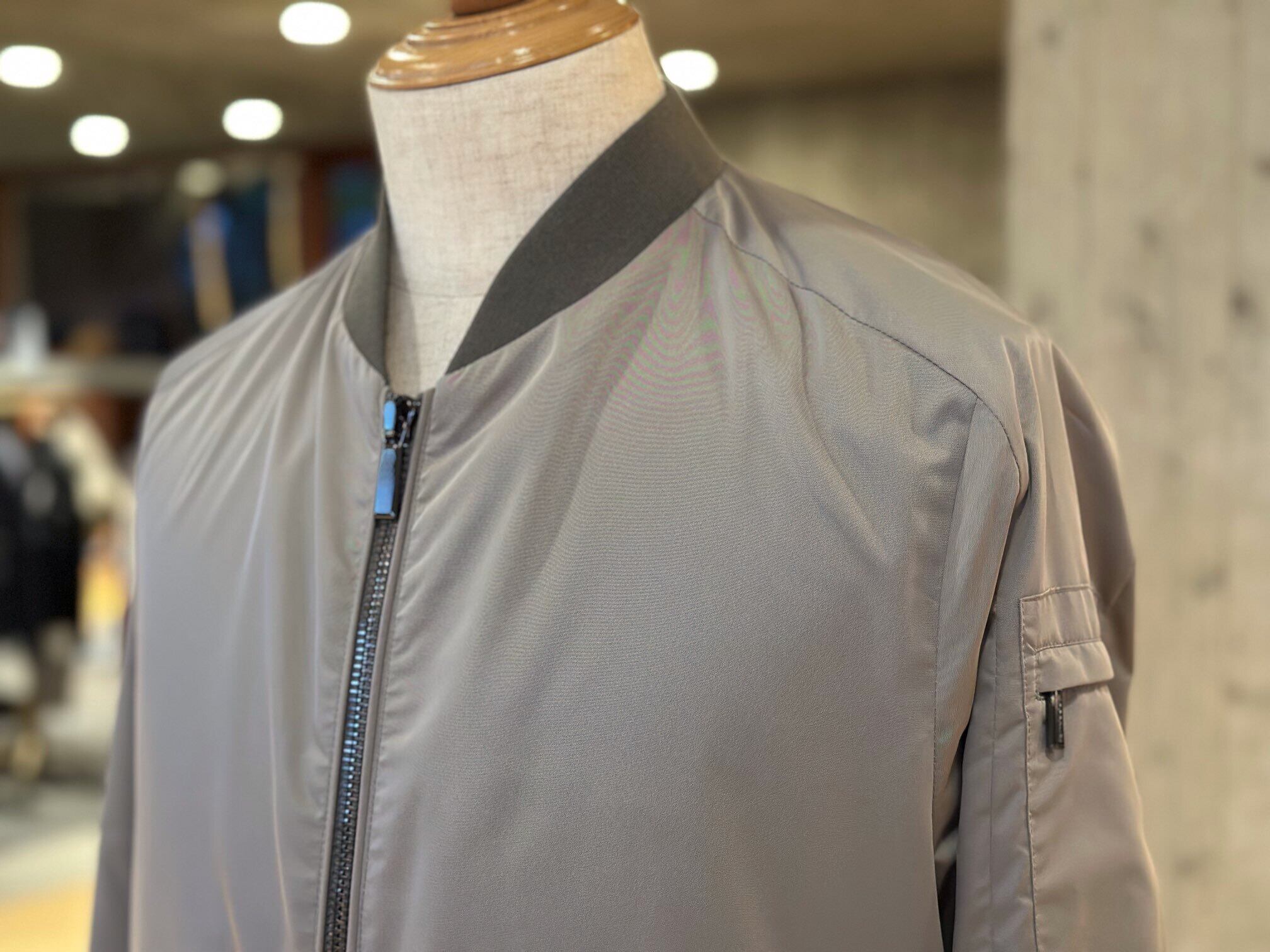 樹脂加工を施し、撥水性のあるシェイプメモリー(形状記憶)ファブリックで仕立てたボンバージャケット。襟と裾には、軽妙なコントラストをなすサテンニットファブリックをあしらいました。ウェルトポケットはファスナー付き。フロントには、目の粗いサイズ8のダブルスライダーファスナー付き。セミラグランスリーブと、袖にあしらったポケットで、クラシックなアビエイタータイプのボンバージャケットにモダンなアレンジを加えています。裏地付き。