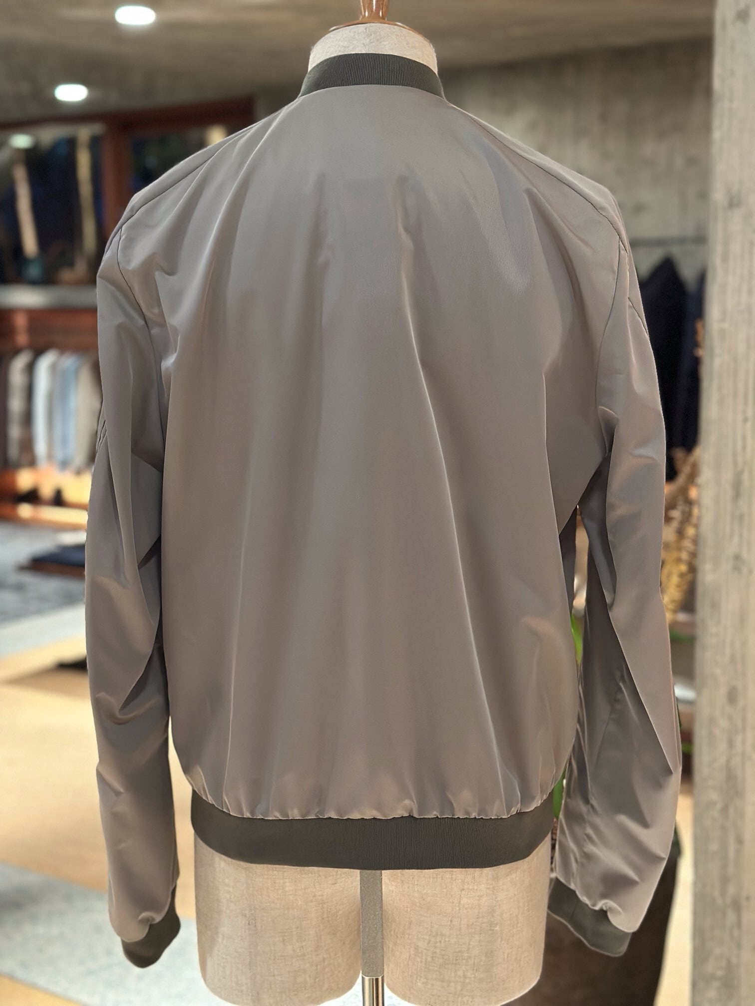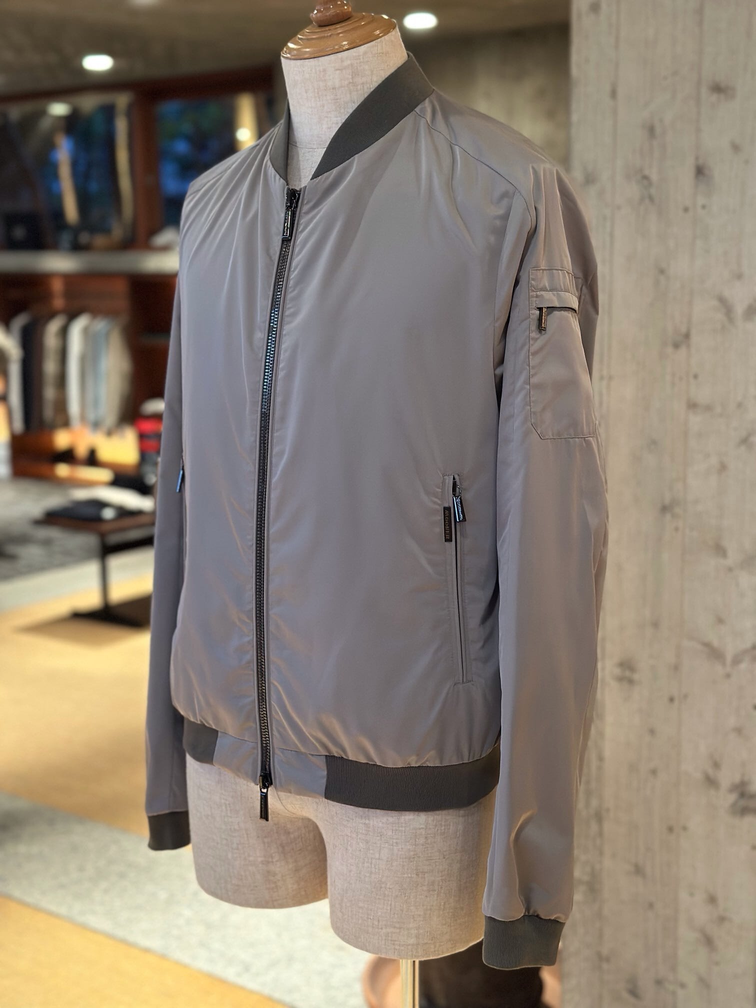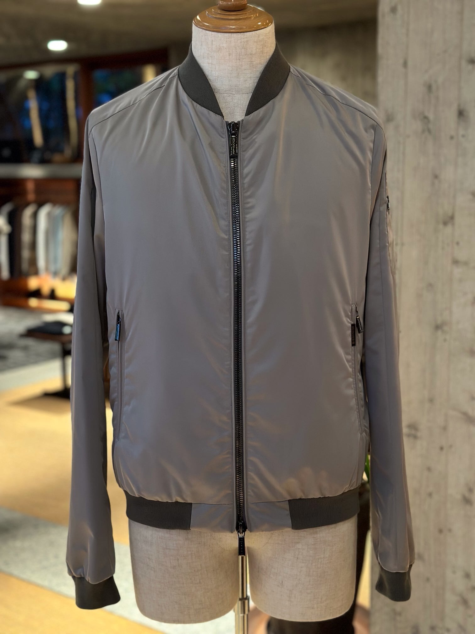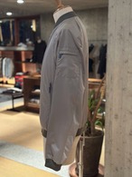 樹脂加工を施し、撥水性のあるシェイプメモリー(形状記憶)ファブリックで仕立てたボンバージャケット。襟と裾には、軽妙なコントラストをなすサテンニットファブリックをあしらいました。ウェルトポケットはファスナー付き。フロントには、目の粗いサイズ8のダブルスライダーファスナー付き。セミラグランスリーブと、袖にあしらったポケットで、クラシックなアビエイタータイプのボンバージャケットにモダンなアレンジを加えています。裏地付き。