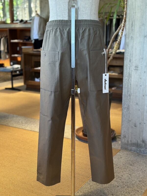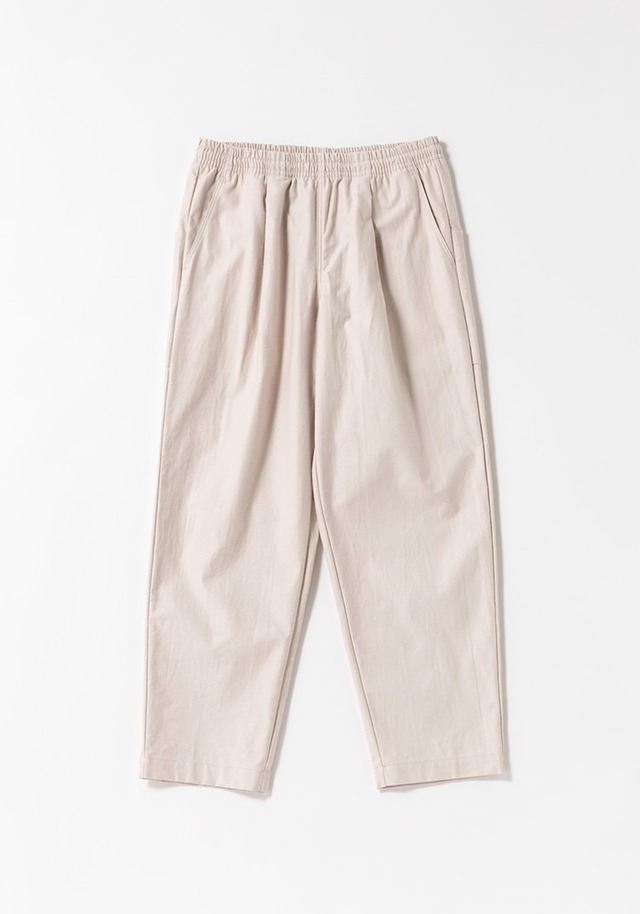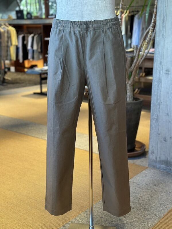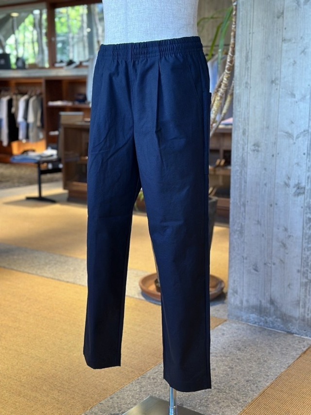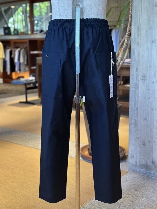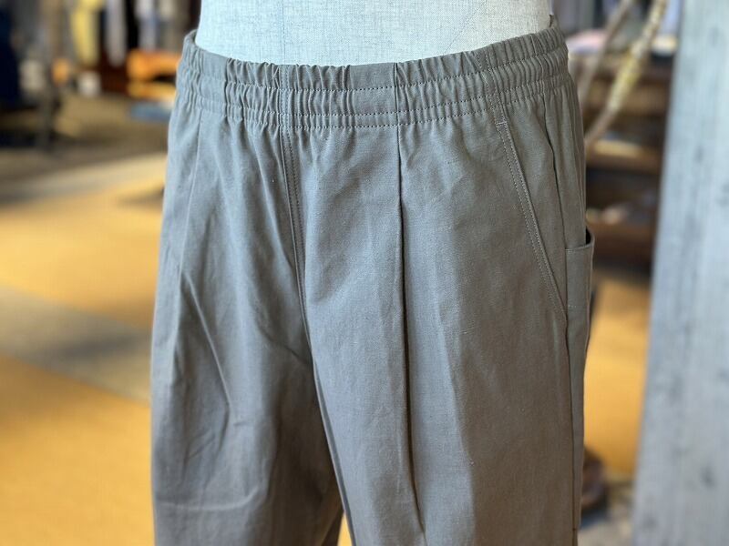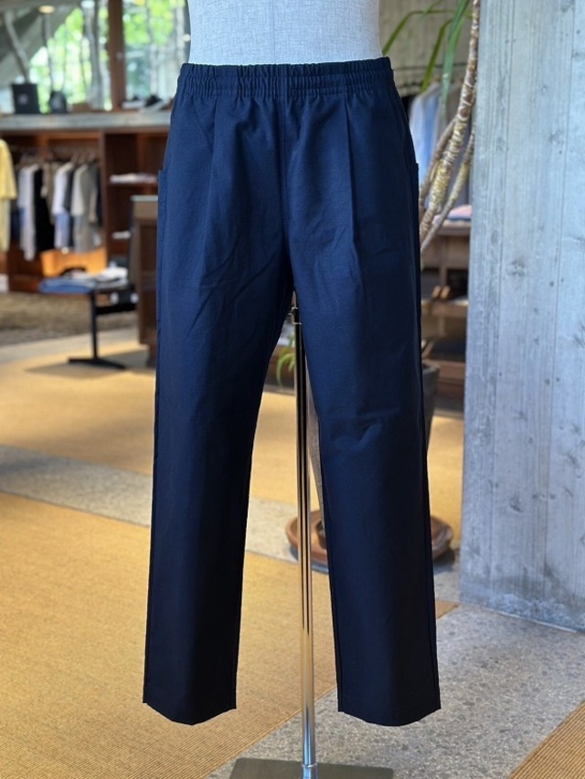 乾燥感のあるアメリカ、オーストラリアの混合綿を使用、その原綿をカーディングする際、機械の調整でネップを作り、レピア織機で糸に強度を加えながら織ることで生地自体の強度を高めたバックネップ素材を使用したBNアンプスパンツです。このバックネップ素材は表面に上品さを出すためシルケット加工をせず染色、ネップの凹凸を残しながら自然で上品な表情に仕上げました。またハリコシを出すために樹脂で硬仕上げを施し防風性の向上と洗濯による形状変化を抑える加工を加えました。デザインはBaseballの球審の腰回りのシルエットを参考にスペアボールを入れていたような大きめのマチ付きポケットを配しました。腰回りはゆったりとしながらも裾にかけて強めのテーパーですっきり見える設計です。ウエストはゴムとコードで調節が可能です。