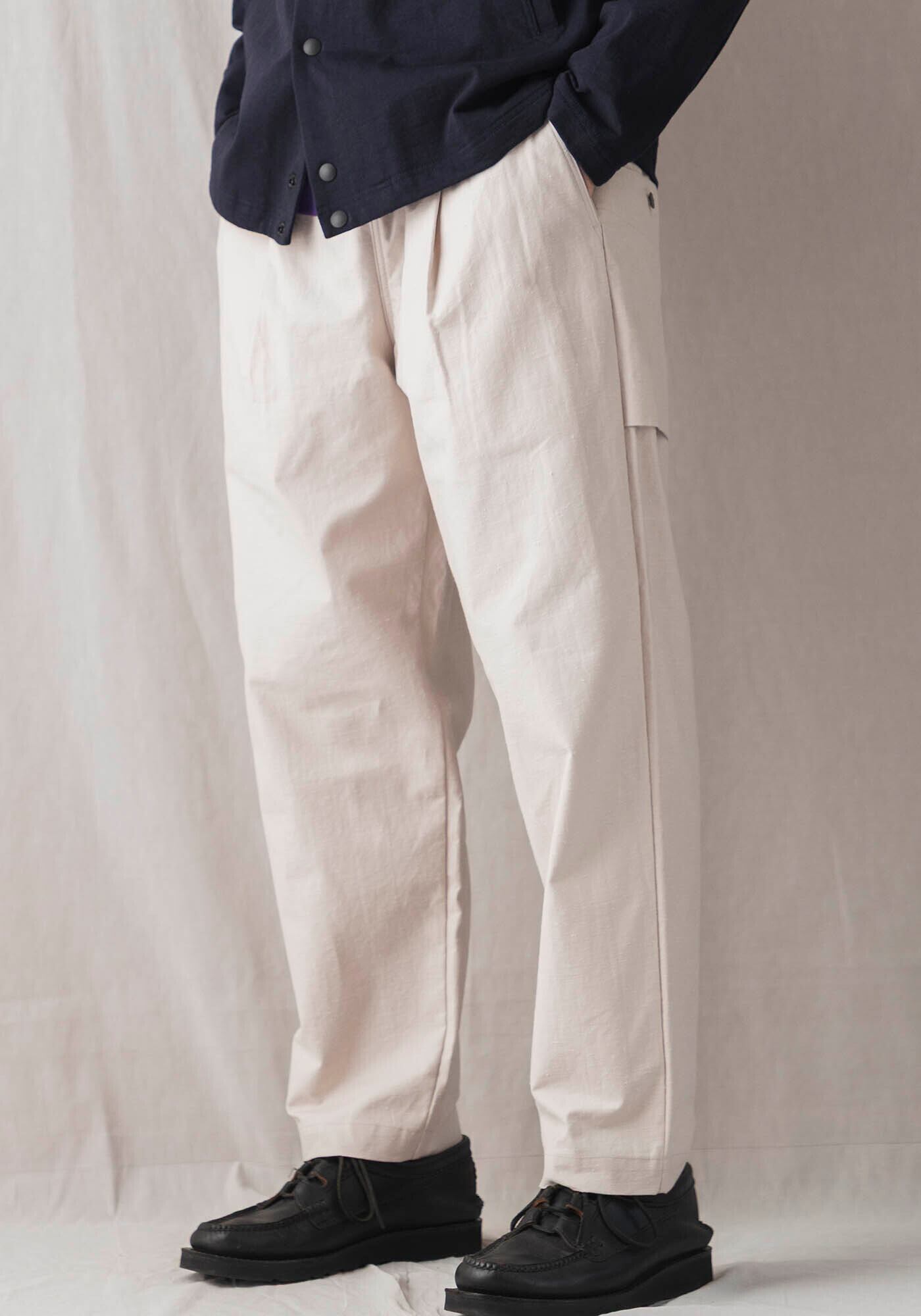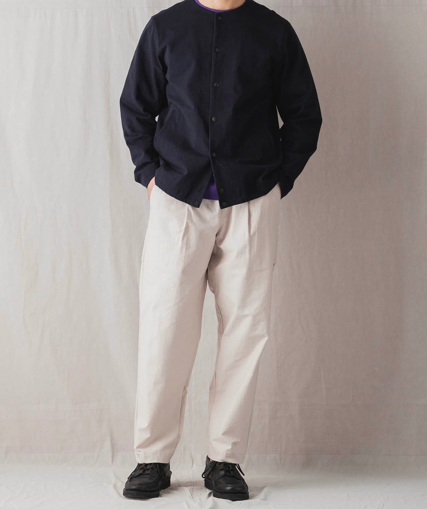 乾燥感のあるアメリカ、オーストラリアの混合綿を使用、その原綿をカーディングする際、機械の調整でネップを作り、レピア織機で糸に強度を加えながら織ることで生地自体の強度を高めたバックネップ素材を使用したBNアンプスパンツです。このバックネップ素材は表面に上品さを出すためシルケット加工をせず染色、ネップの凹凸を残しながら自然で上品な表情に仕上げました。またハリコシを出すために樹脂で硬仕上げを施し防風性の向上と洗濯による形状変化を抑える加工を加えました。デザインはBaseballの球審の腰回りのシルエットを参考にスペアボールを入れていたような大きめのマチ付きポケットを配しました。腰回りはゆったりとしながらも裾にかけて強めのテーパーですっきり見える設計です。ウエストはゴムとコードで調節が可能です。