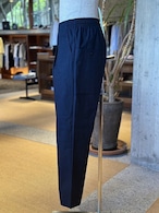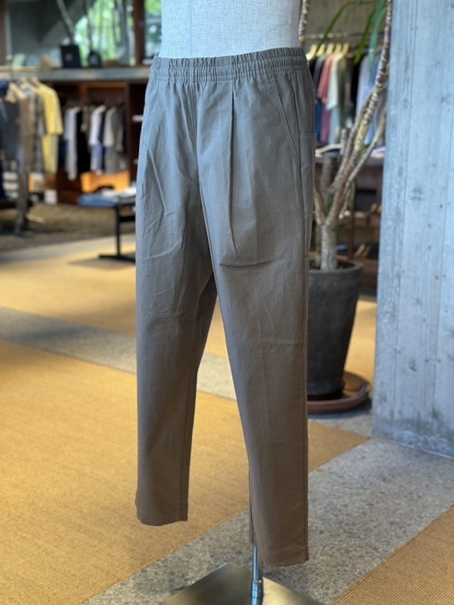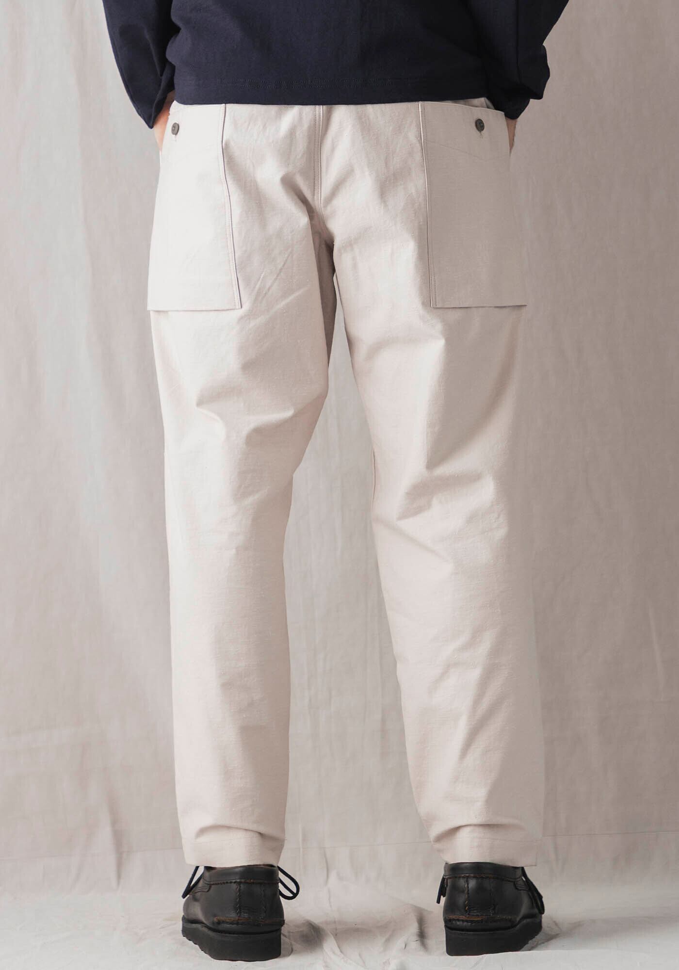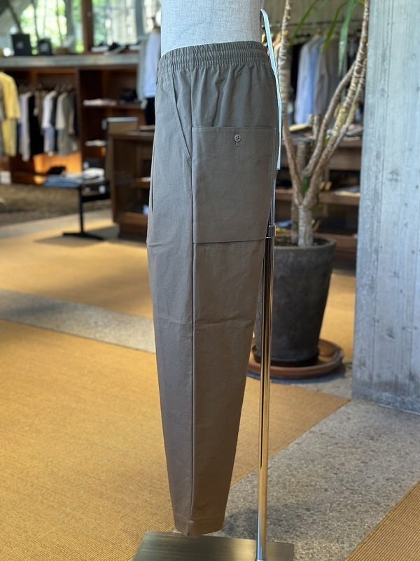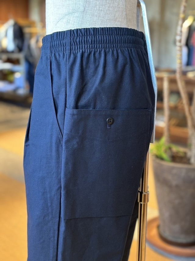 乾燥感のあるアメリカ、オーストラリアの混合綿を使用、その原綿をカーディングする際、機械の調整でネップを作り、レピア織機で糸に強度を加えながら織ることで生地自体の強度を高めたバックネップ素材を使用したBNアンプスパンツです。このバックネップ素材は表面に上品さを出すためシルケット加工をせず染色、ネップの凹凸を残しながら自然で上品な表情に仕上げました。またハリコシを出すために樹脂で硬仕上げを施し防風性の向上と洗濯による形状変化を抑える加工を加えました。デザインはBaseballの球審の腰回りのシルエットを参考にスペアボールを入れていたような大きめのマチ付きポケットを配しました。腰回りはゆったりとしながらも裾にかけて強めのテーパーですっきり見える設計です。ウエストはゴムとコードで調節が可能です。