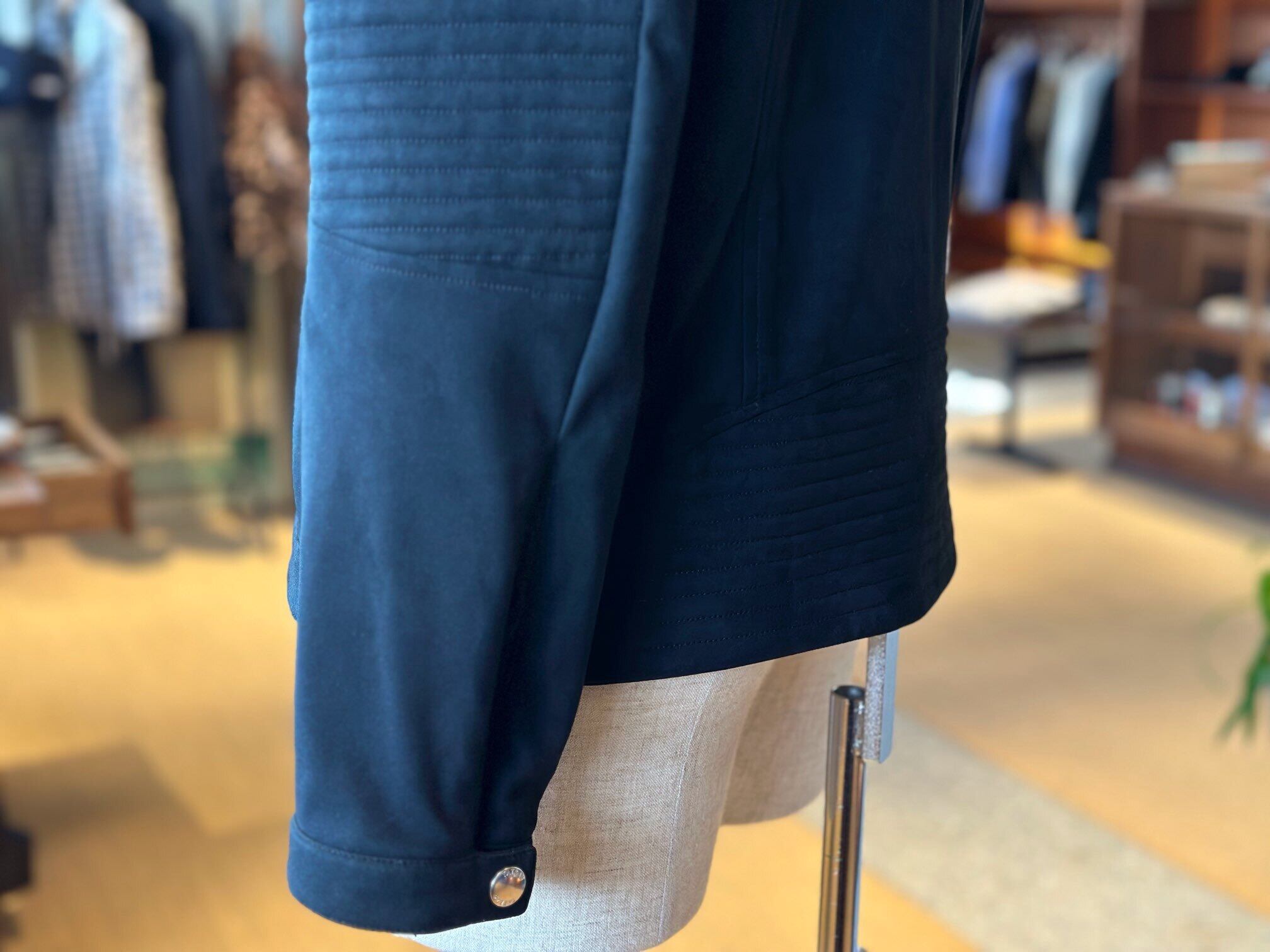 肘や裾は細やかなステッチワークが目を引く生地で切り替え、立体感のある表情に。