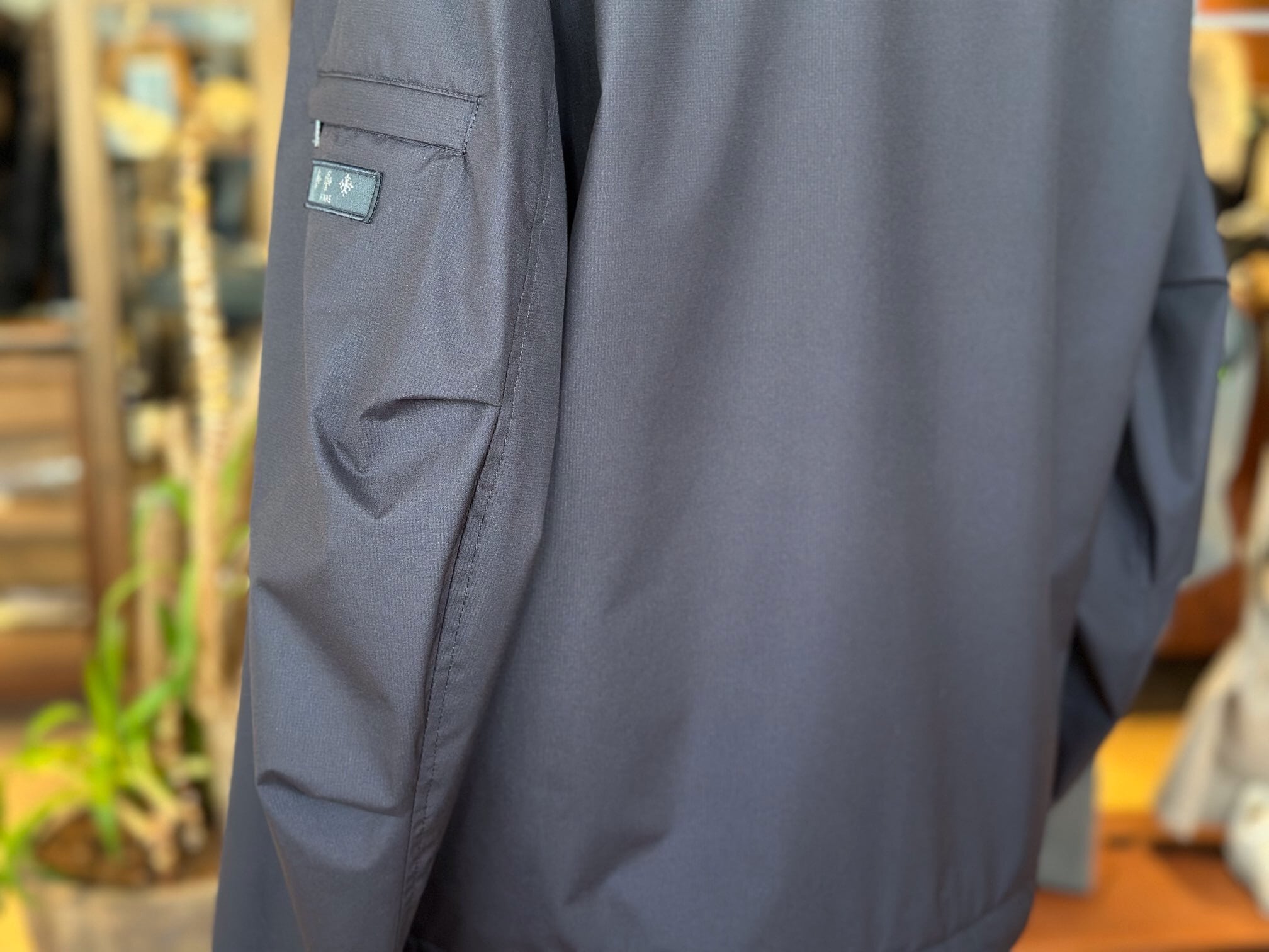 裏面に透湿防水膜をラミネート加工しているため、雨風を防ぎながらも蒸れにくく軽量な着心地を実現。