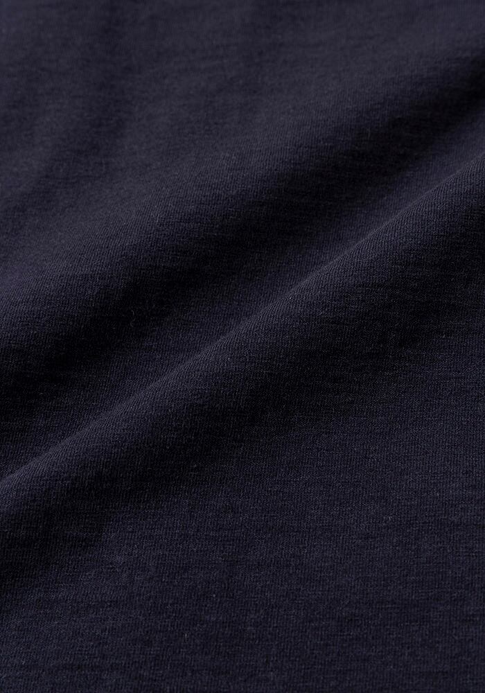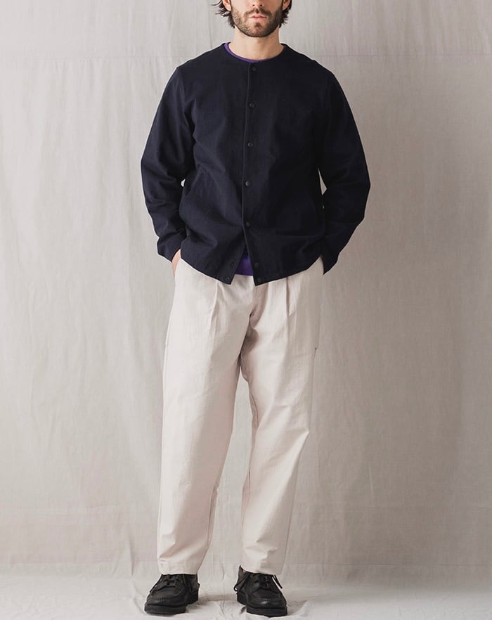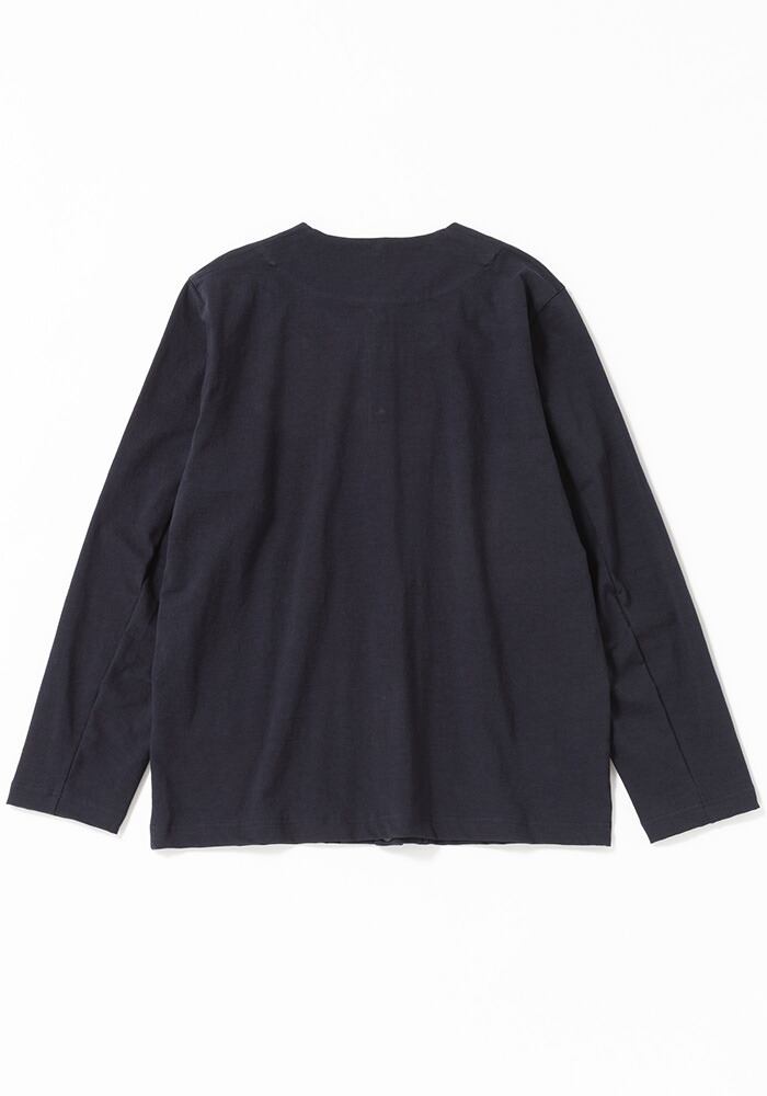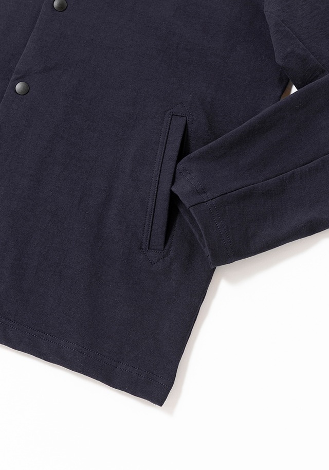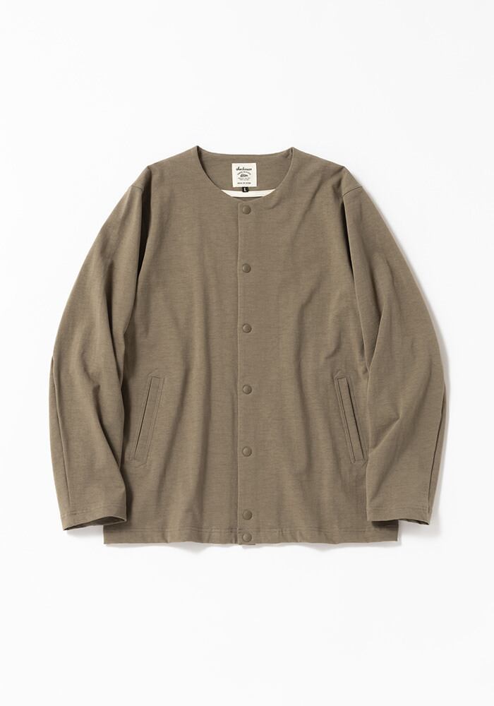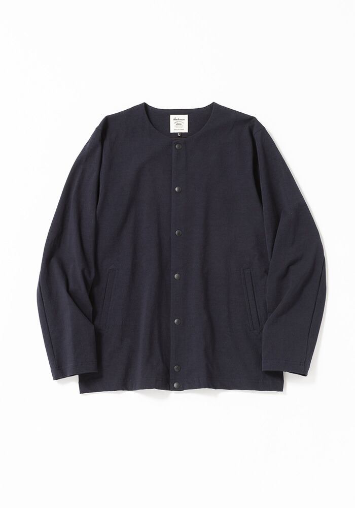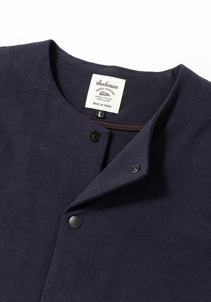 伸縮性の高いポリウレタン糸を綿糸でカバーリングした糸を高密度で編立てた素材を使用したカラーレスジャケットです。肌触りは綿特有の柔らかさがありますが、高密度で編み立てることでハリ感が出て季節を問わず着用できます。度目をしっかり詰めることで肘の抜けがほとんどなく型崩れも起きにくいのが特長です。またストレッチ天竺素材は着用時に窮屈感がなく、身体の動きに合わせて適度に伸縮しますので動きやすく、長時間の着用でも疲れにくいです。デザインはBaseballユニフォームのような首周りが特徴的な襟のない仕様で首元からインナーの表情も見せることができます。表面の光沢感を抑えたことで同素材のトラウザー(JM4511)と組み合わせてカジュアルに着こなすセットアップとして着用できます。家庭洗濯可能、陰干し推奨です。