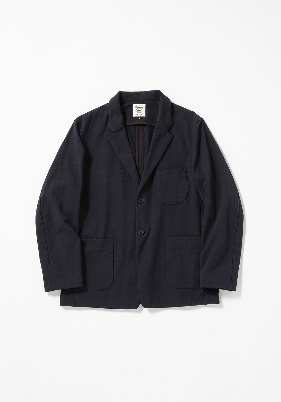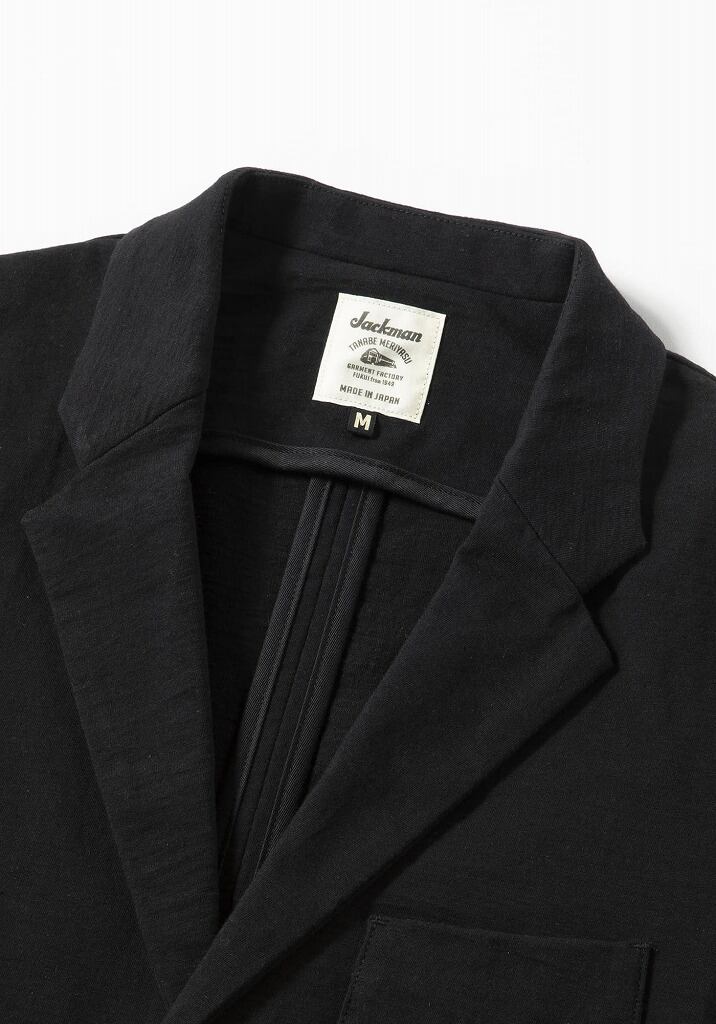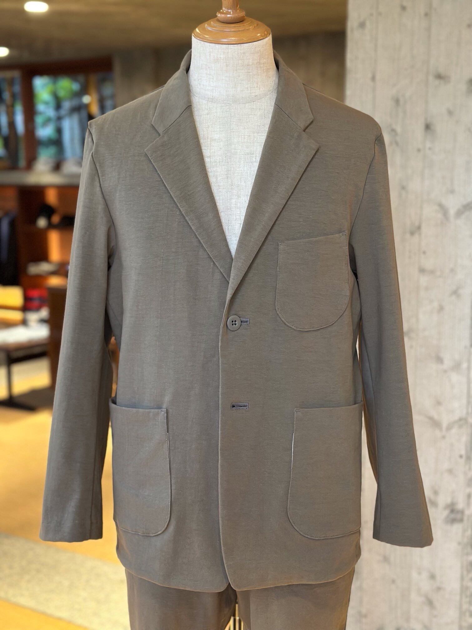 伸縮性の高いポリウレタン糸を綿糸でカバーリングした糸を高密度で編立てた素材を使用したテーラードジャケットです。肌触りは綿特有の柔らかさがありますが、高密度で編み立てることでハリ感が出て季節を問わず着用できます。度目をしっかり詰めることで肘の抜けがほとんどなく型崩れも起きにくいのが特長です。またストレッチ天竺素材は着用時に窮屈感がなく、身体の動きに合わせて適度に伸縮しますので動きやすく、光沢感を抑えることで同素材のトラウザー(JM4955)と組み合わせてビジネスでも着用できます。