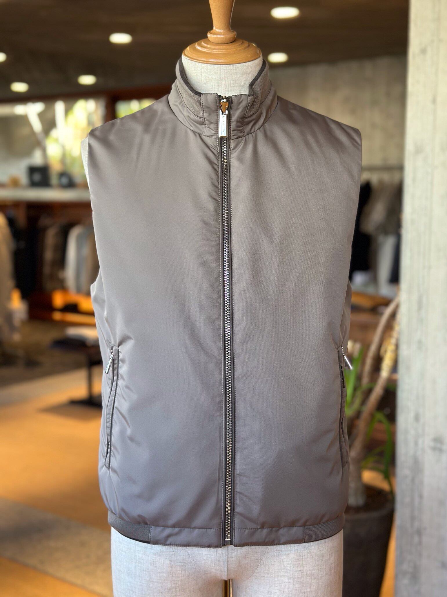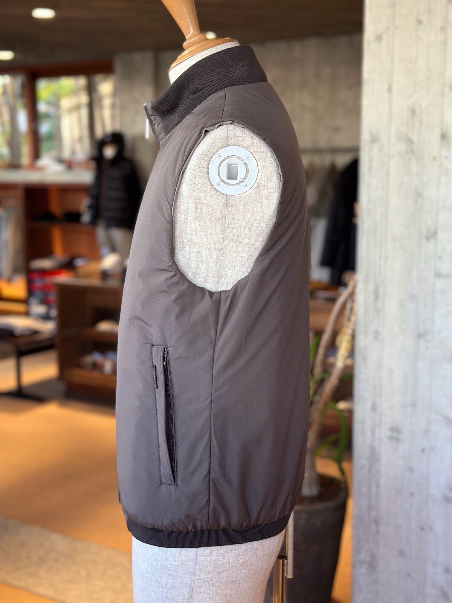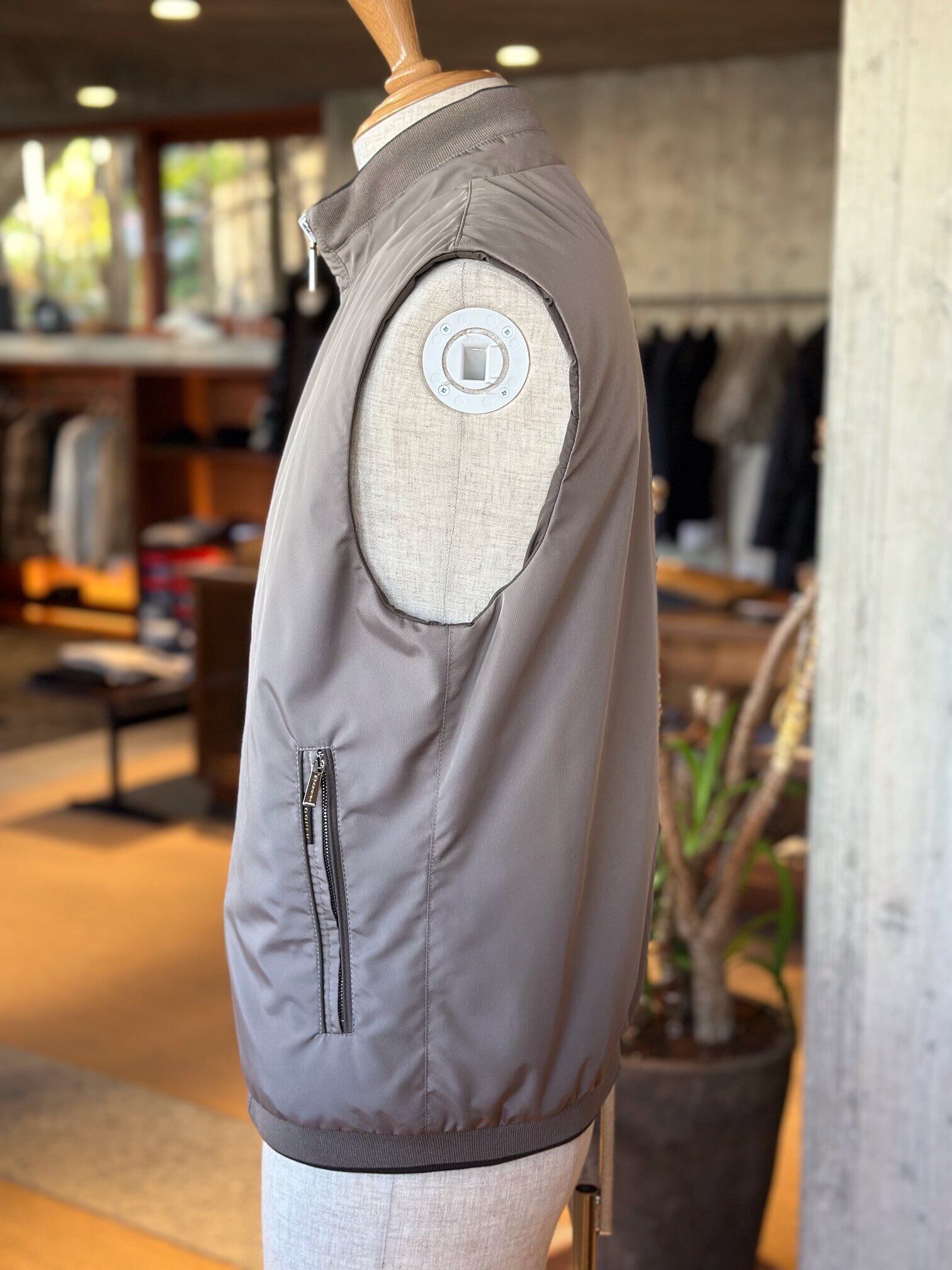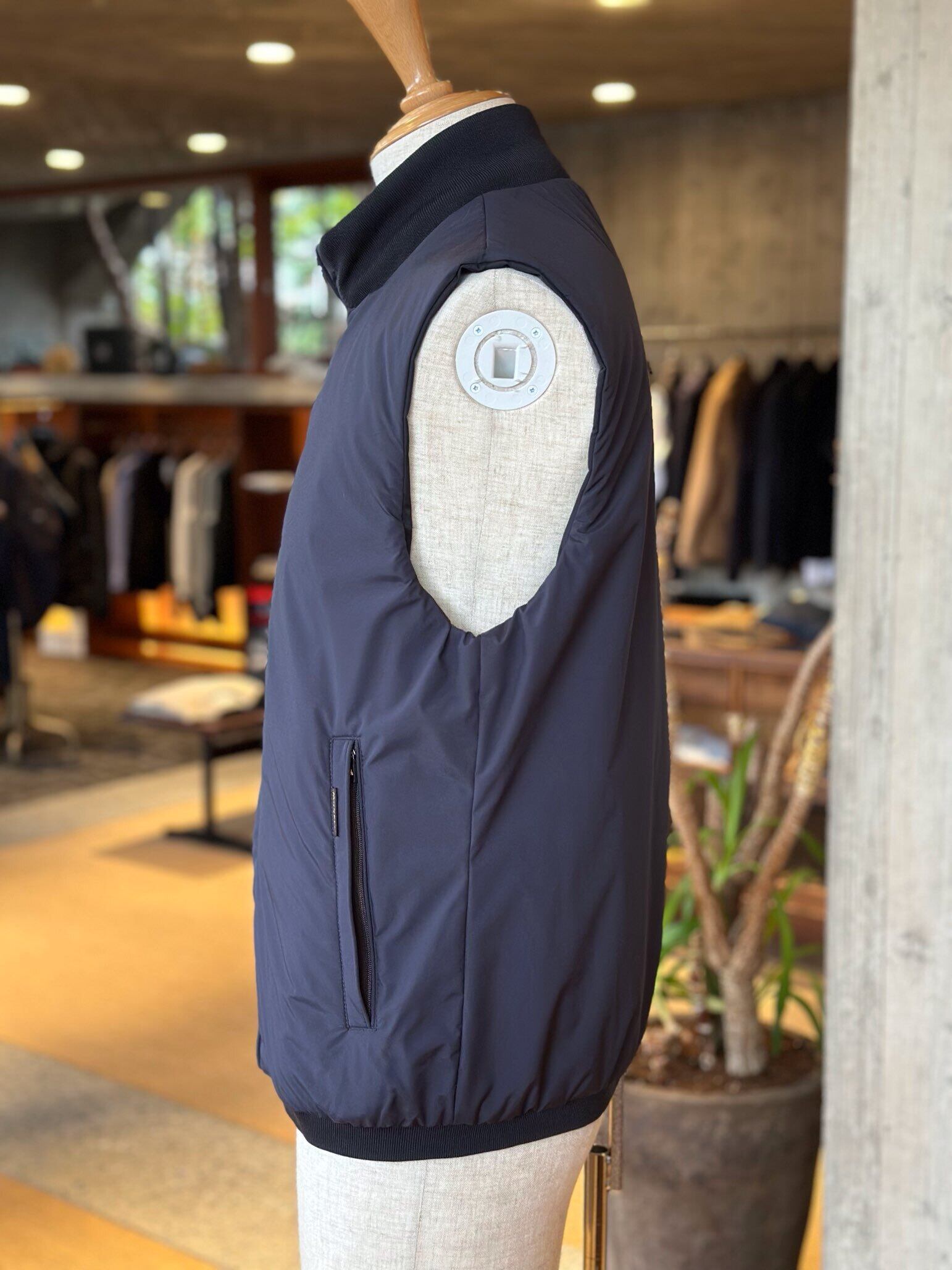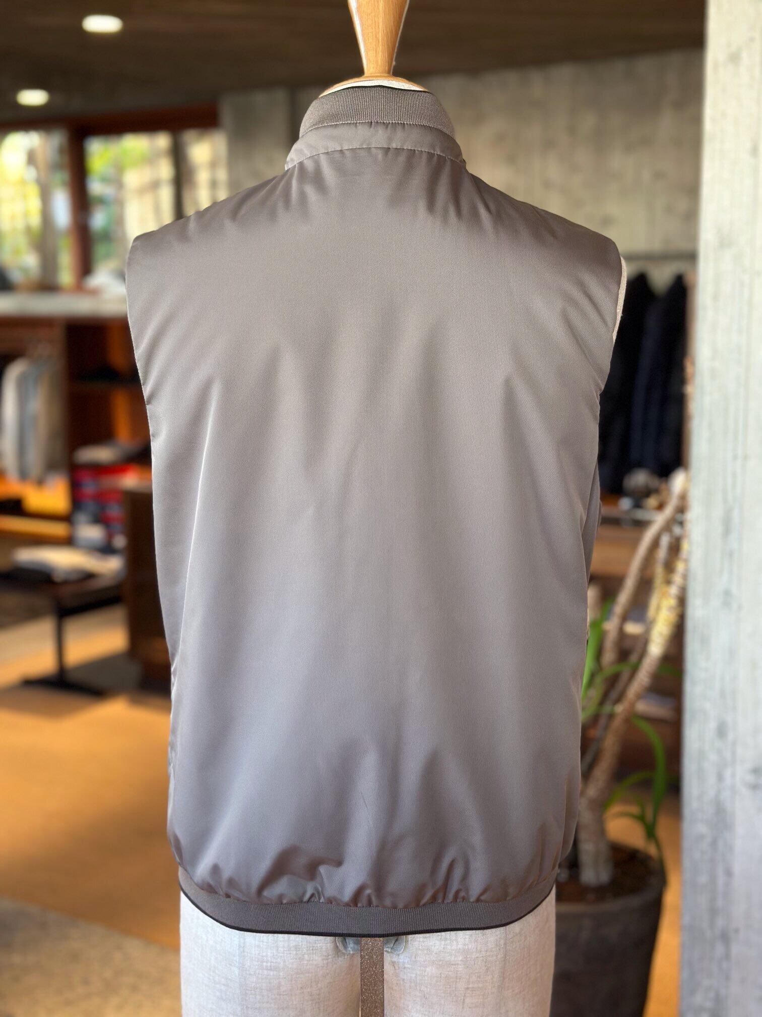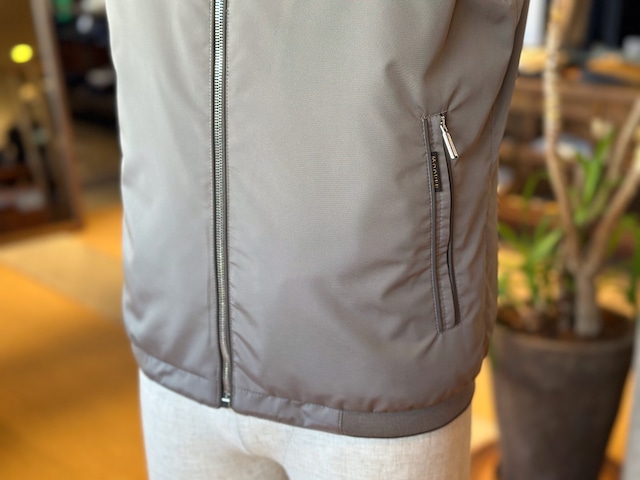 リバーシブル仕様のジレは、フロントはダブルスライダーのファスナーで開閉。