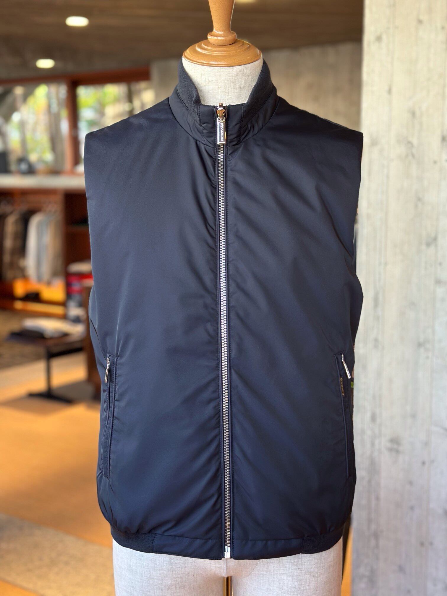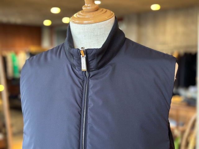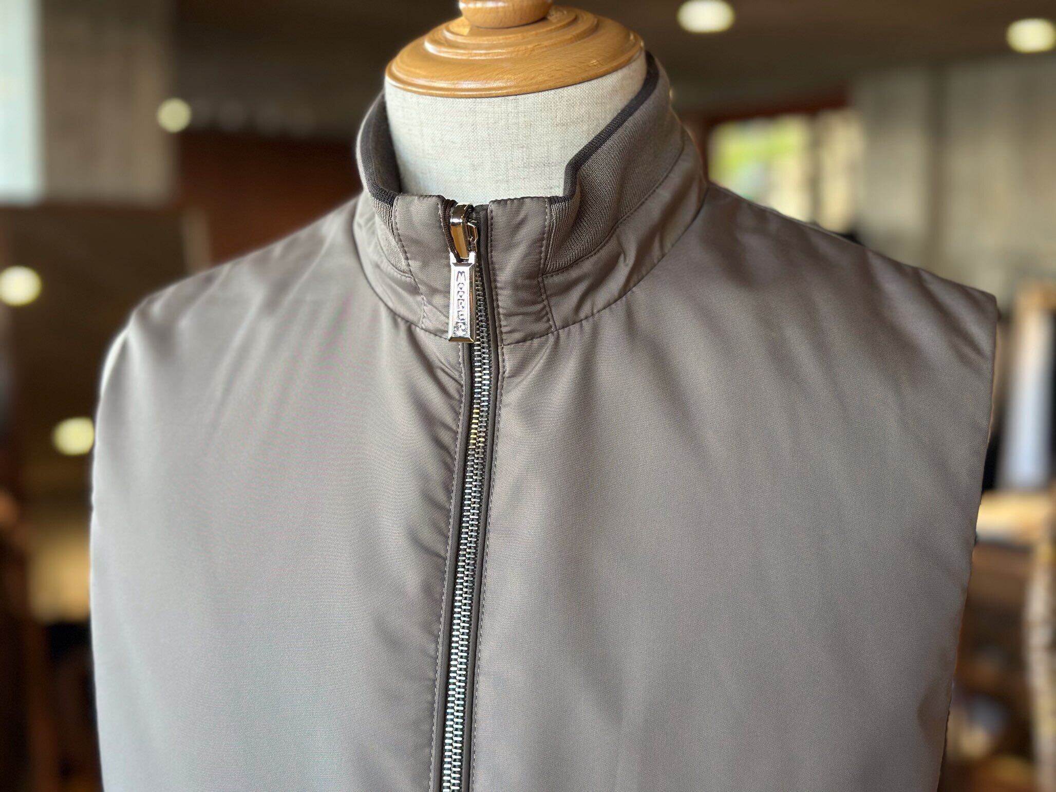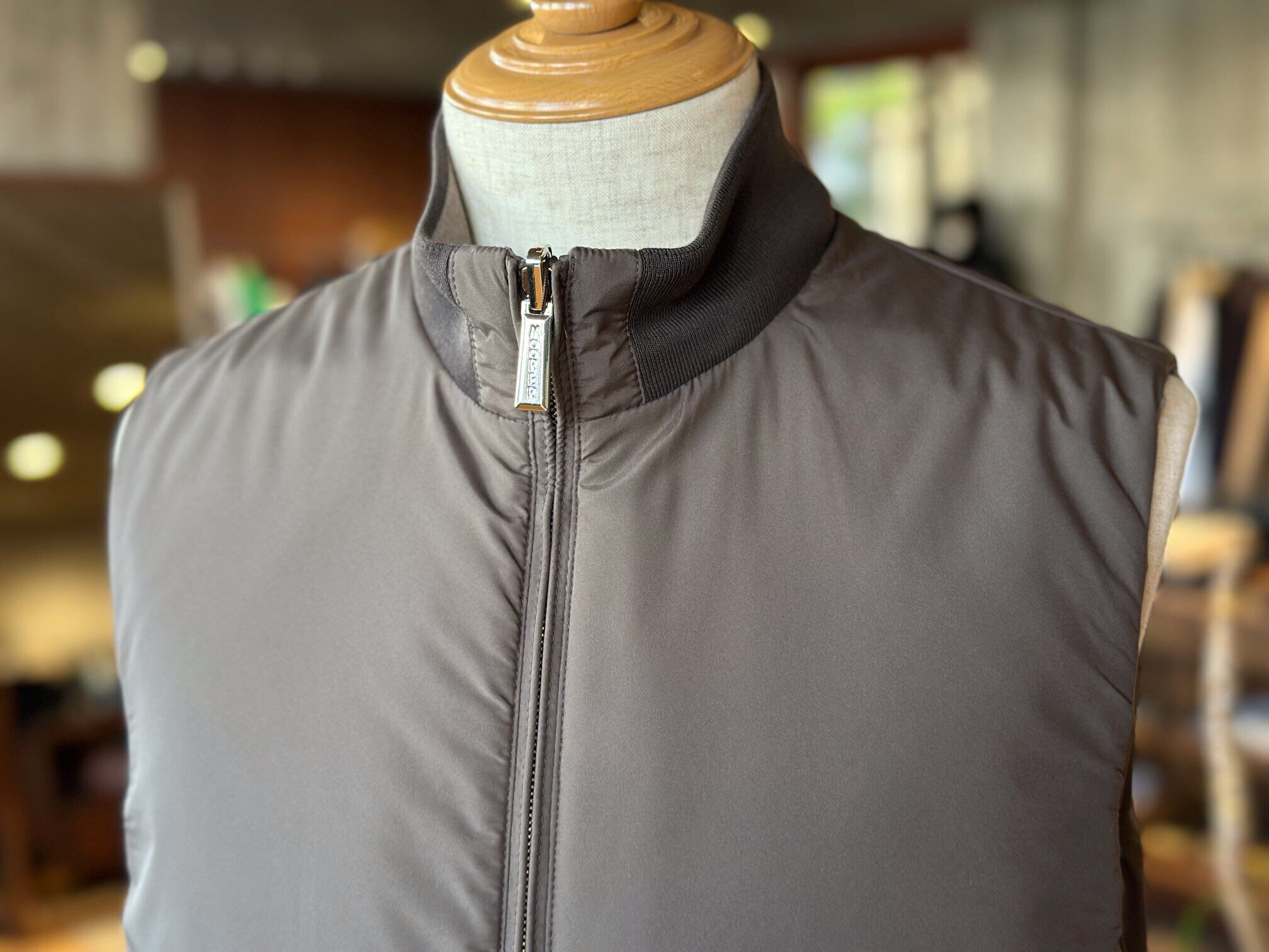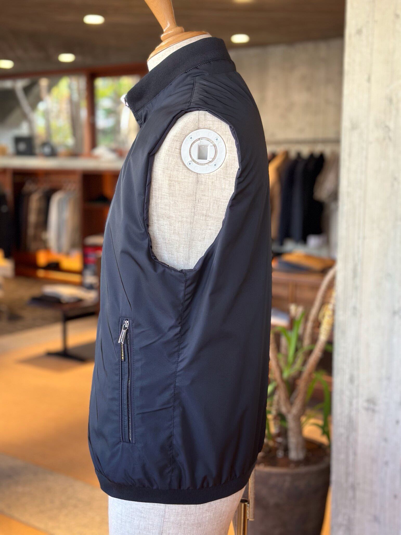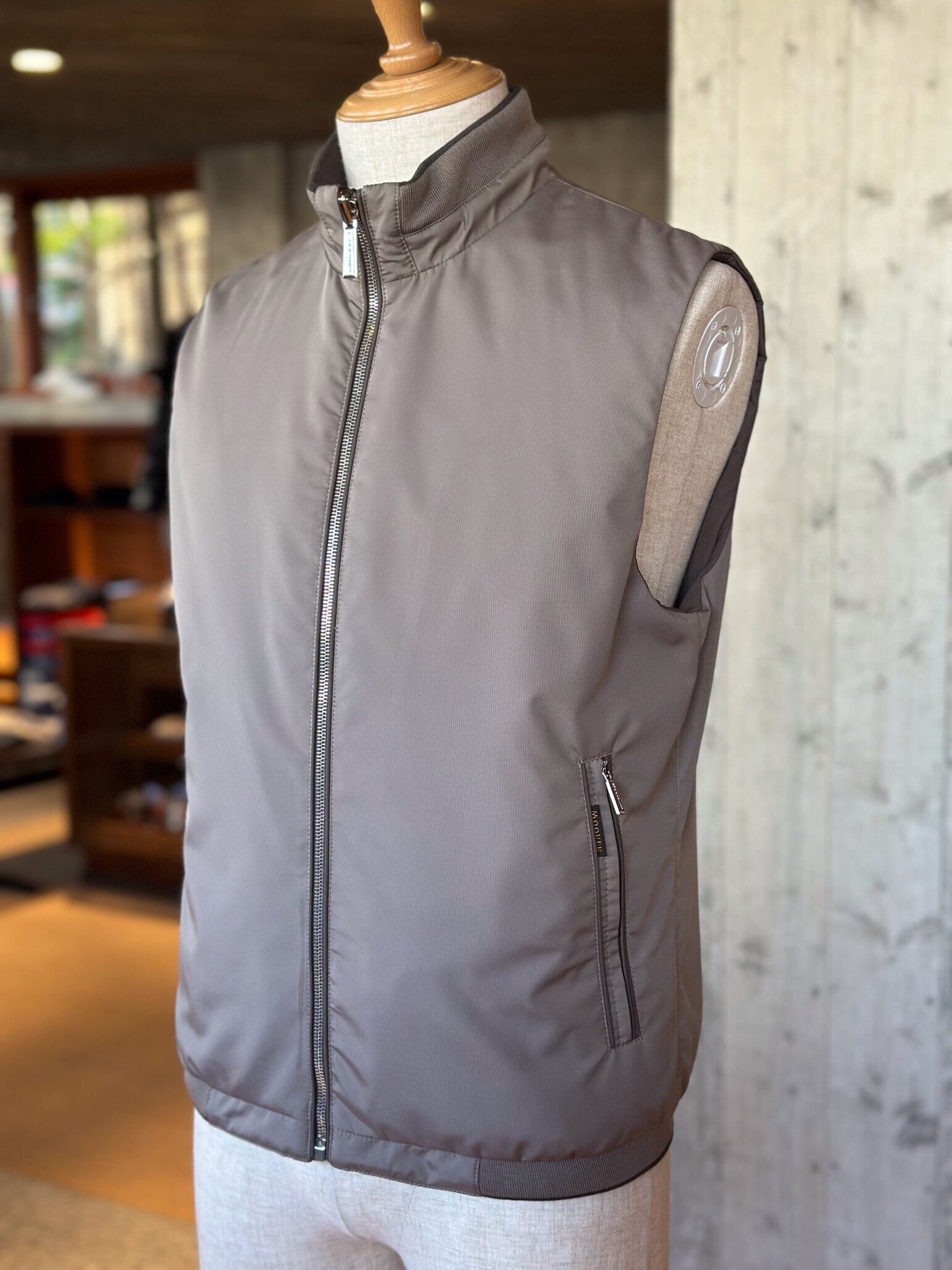 リバーシブル仕様のジレは、フロントはダブルスライダーのファスナーで開閉。