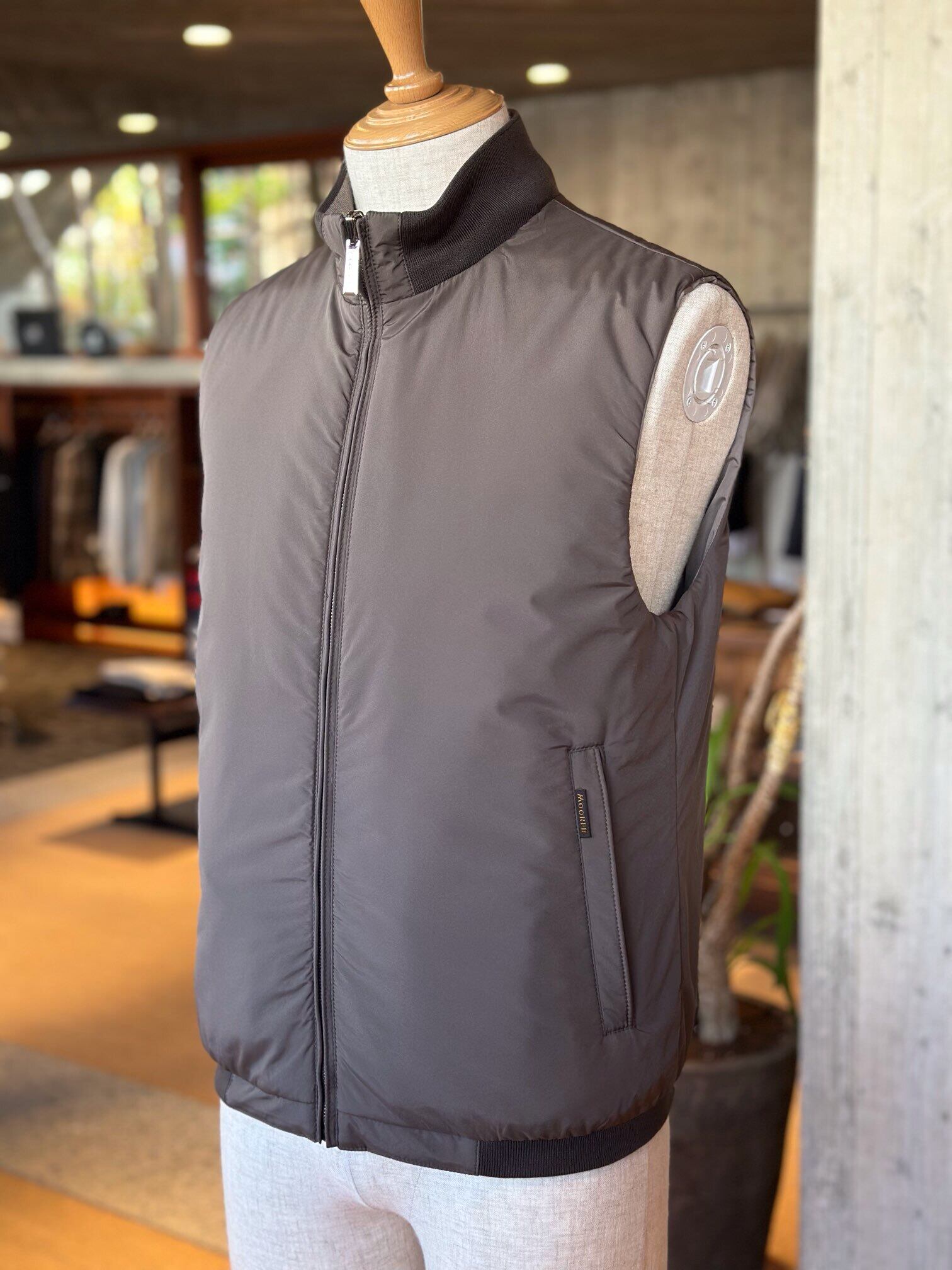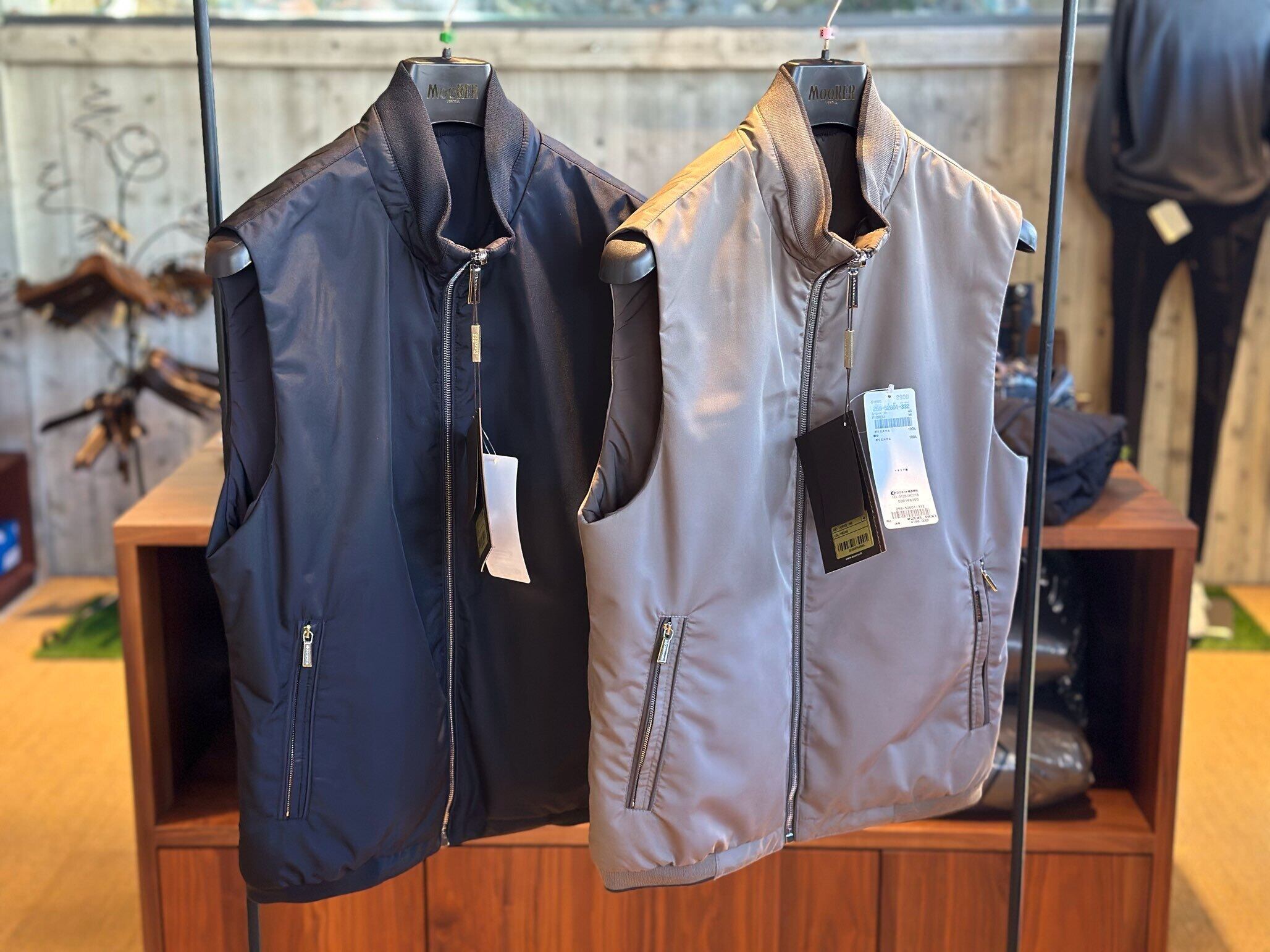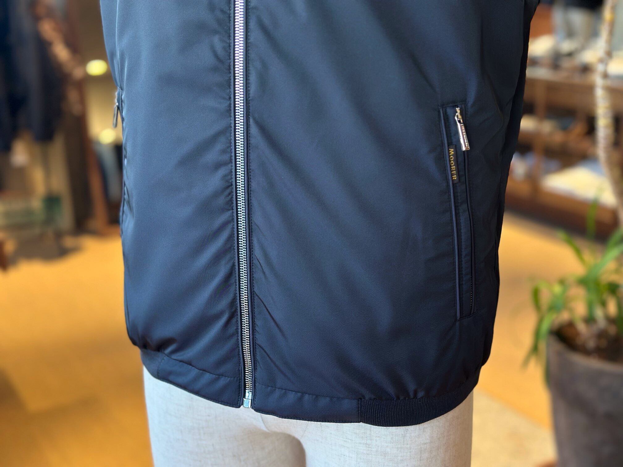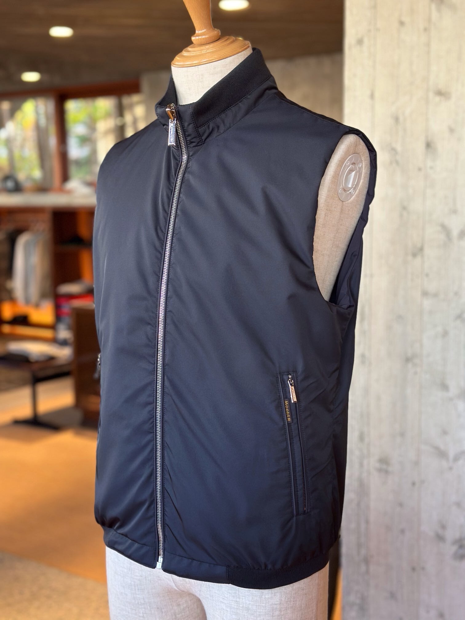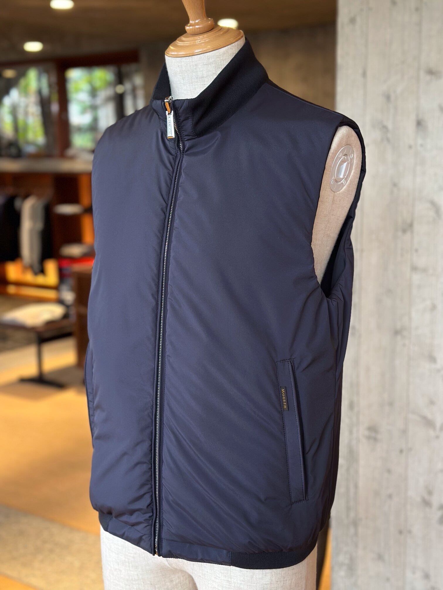 リバーシブル仕様のジレは、フロントはダブルスライダーのファスナーで開閉。