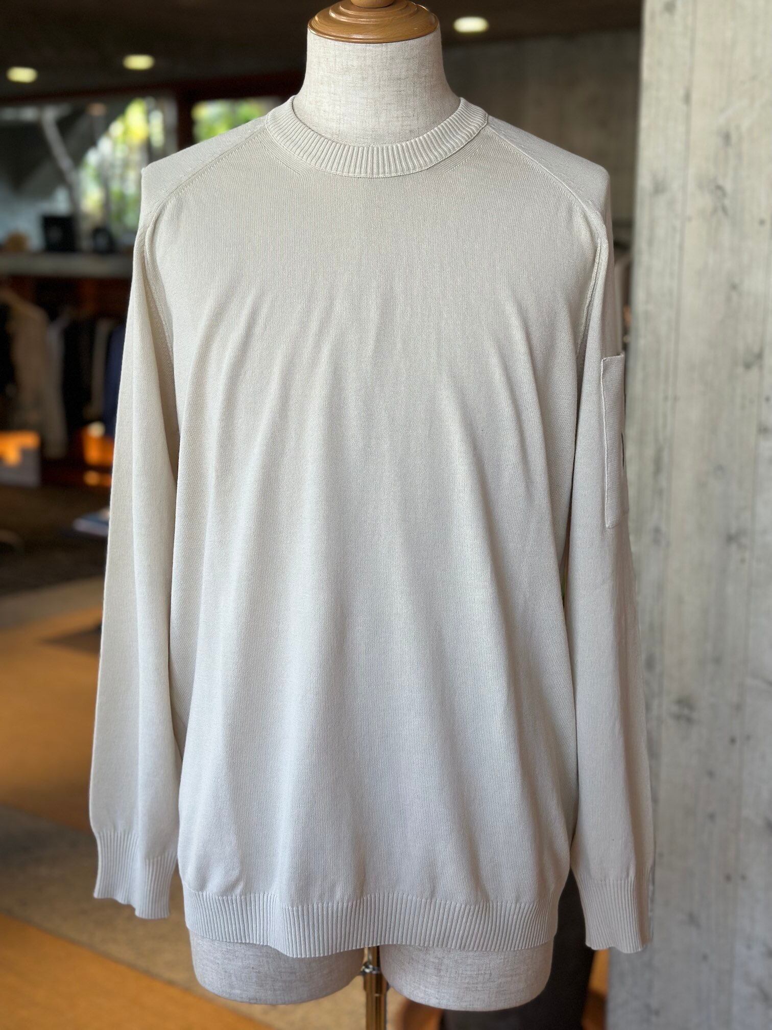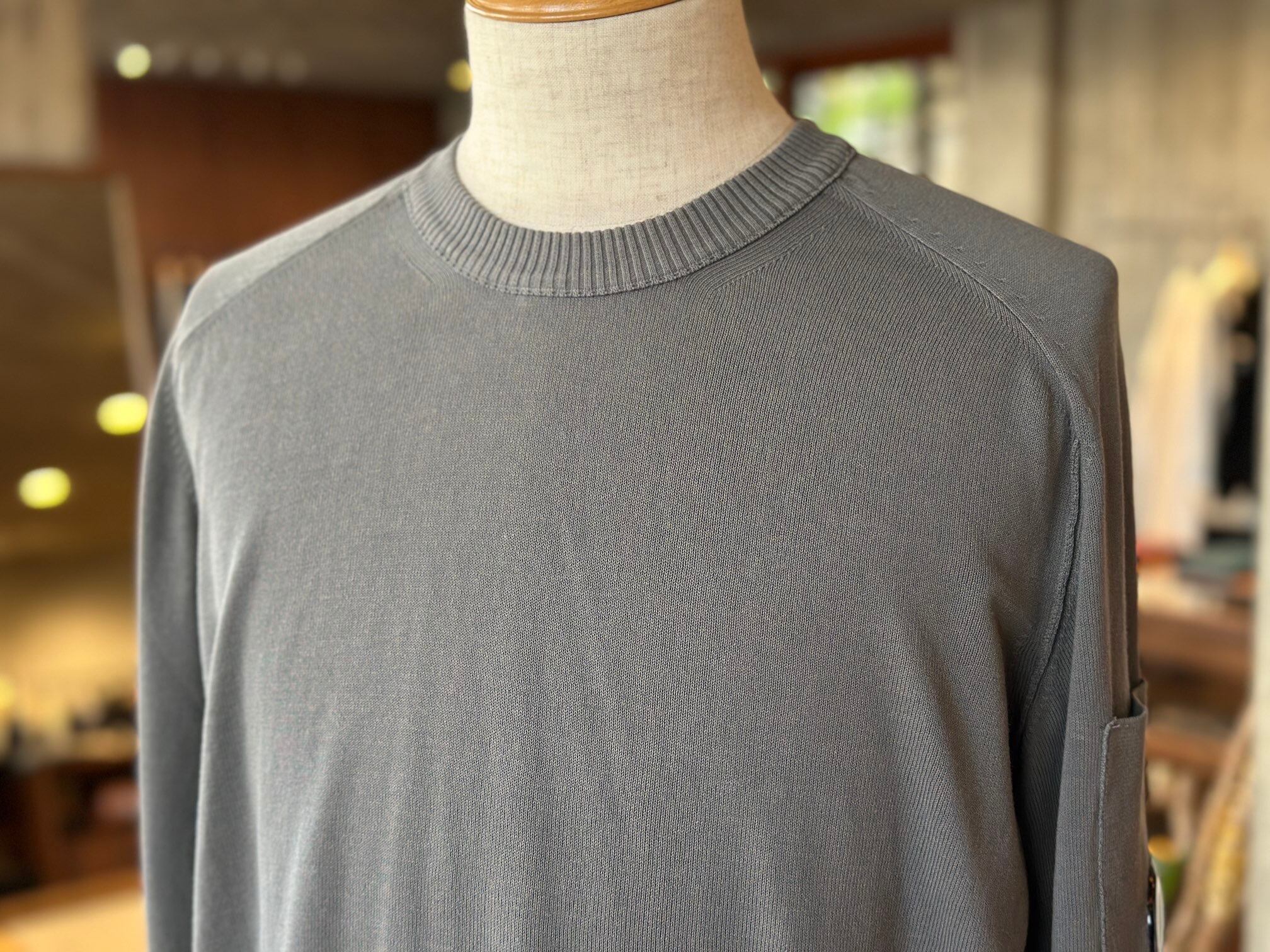 コットンクレープ素材を使用したセーター。軽量で通気性に優れ、自然な不規則な風合いが特徴です。リブ編みのクルーネックと、アームホールに沿ったコントラストステッチが特徴。袖ポケットの象徴的なC.P. Companyレンズ、リブ編みの袖口と裾がデザインを完成させます。『オールド』加工によるガーメントダイで、豊かなトーンのバリエーションと独特の着古した風合いを実現。ゲージ14。イタリア製。レギュラーフィット。