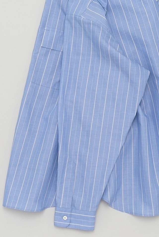 兵庫県の西脇産地で作製したオリジナル先染めシャツ生地のシリーズ。こちらは縦糸を共通させて横糸を綿&ラミーで切り替えて織っています。SH00221はベーシックですが、こちらの品番はバンドカラーのデザインでサイジングはゆったりとしています。