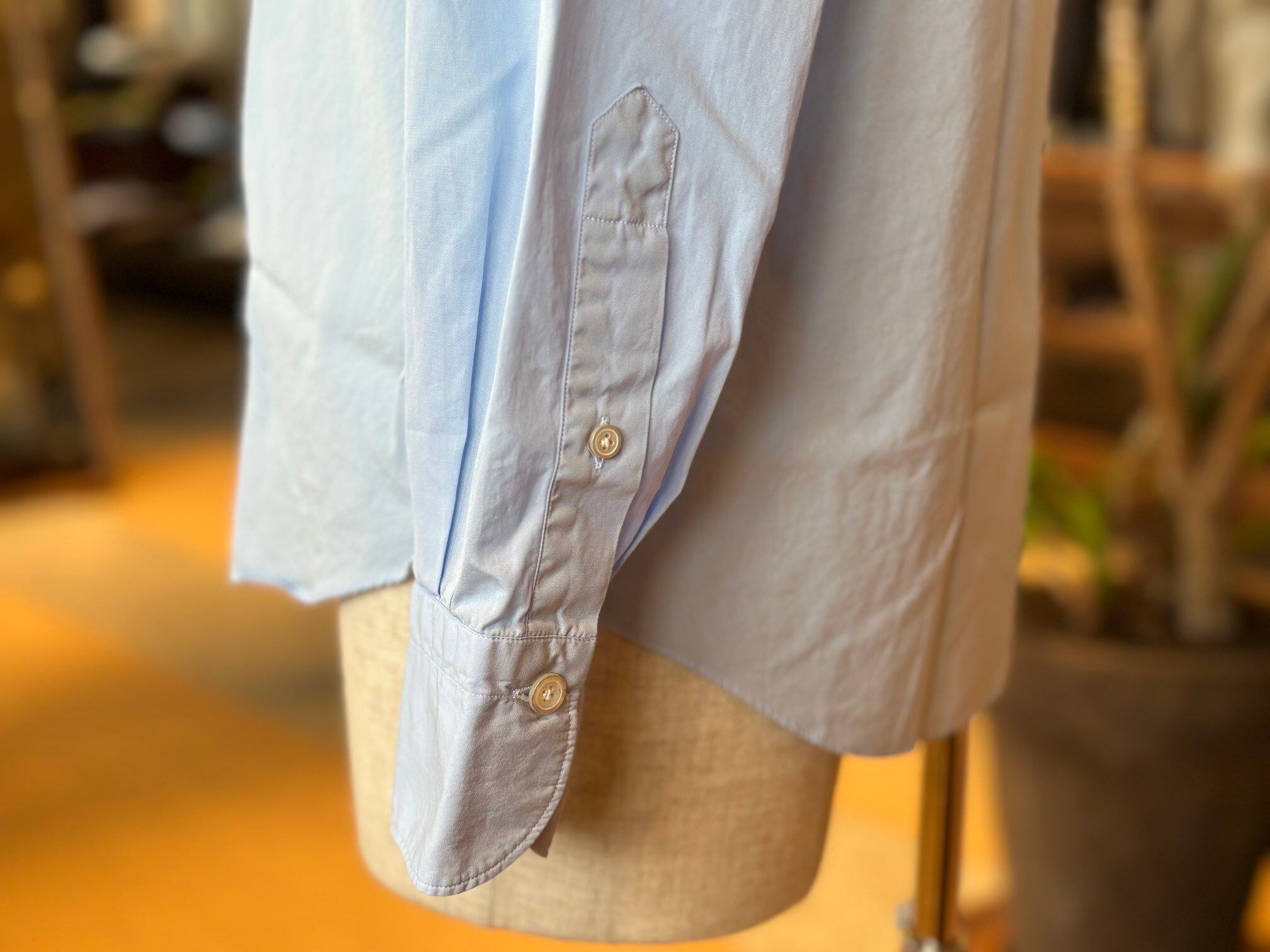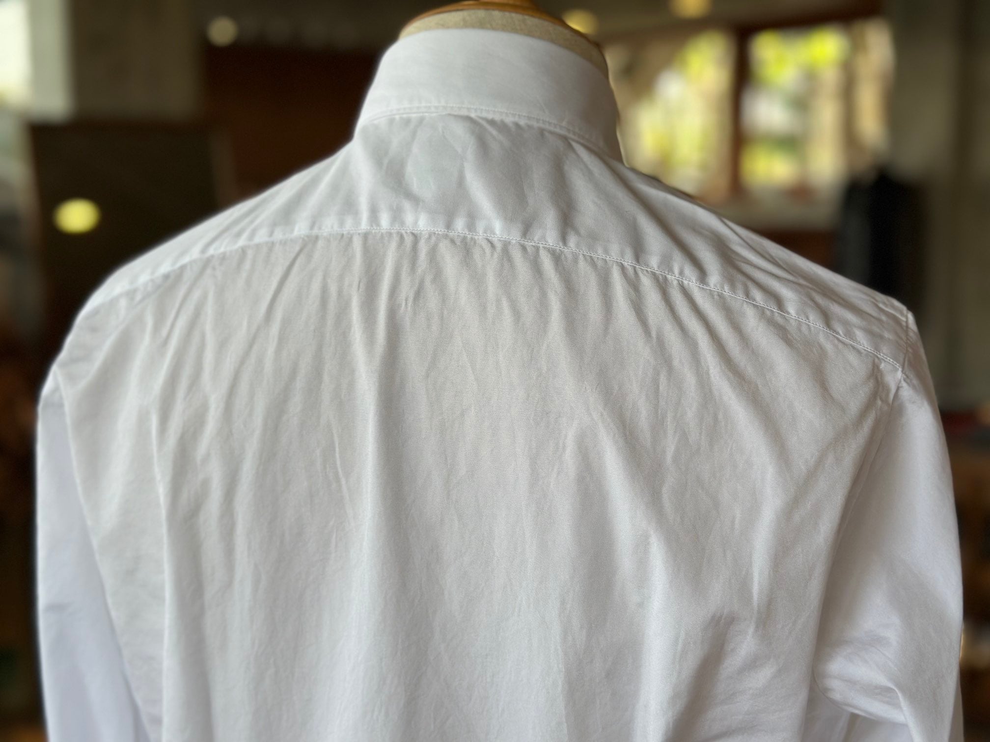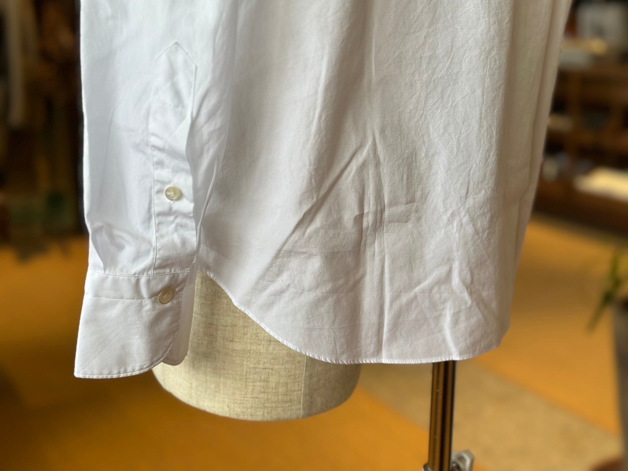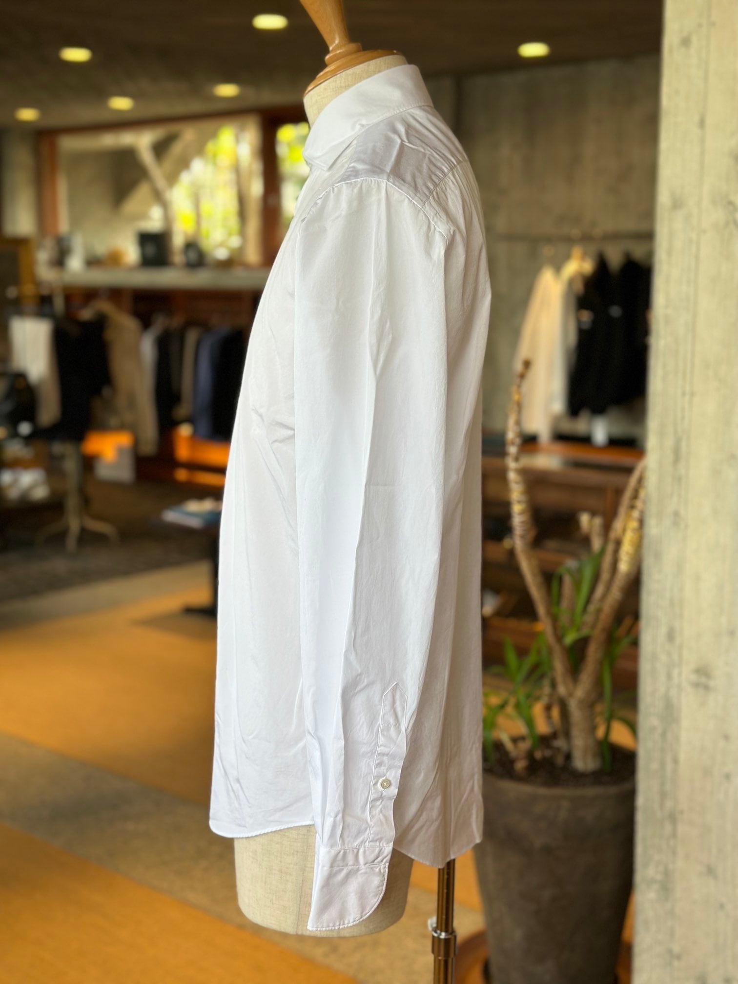袖付け・ボタン付け・ガゼット付けの3工程をハンドメイドで仕上げ、手縫いならではの柔らかな表情と、動きを妨げない独自のパターン設計により、他にはない快適な着心地を実現。肩幅は通常よりややコンパクトに設計しながら、「いせ込み」と前振りの袖付けを組み合わせることで、十分な可動域を確保しており、見た目のシャープですっきりとした印象をあたえますが、まったくストレスを感じさせない着用感が魅力です。身体に自然にフィットしつつ、程よくリラックスしたシルエットは、タックアウトでも美しく映えるよう計算されており、カジュアルからきちんと感のあるスタイリングまで幅広く対応します。