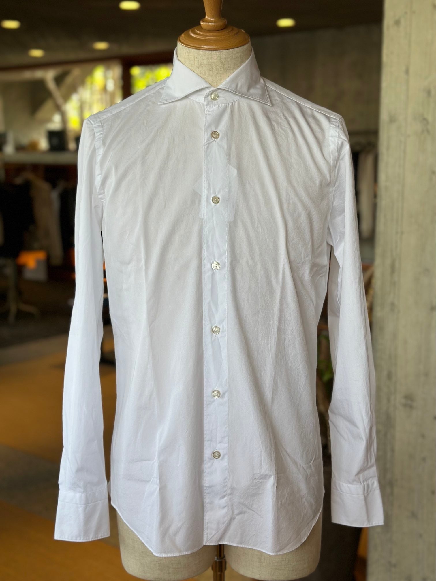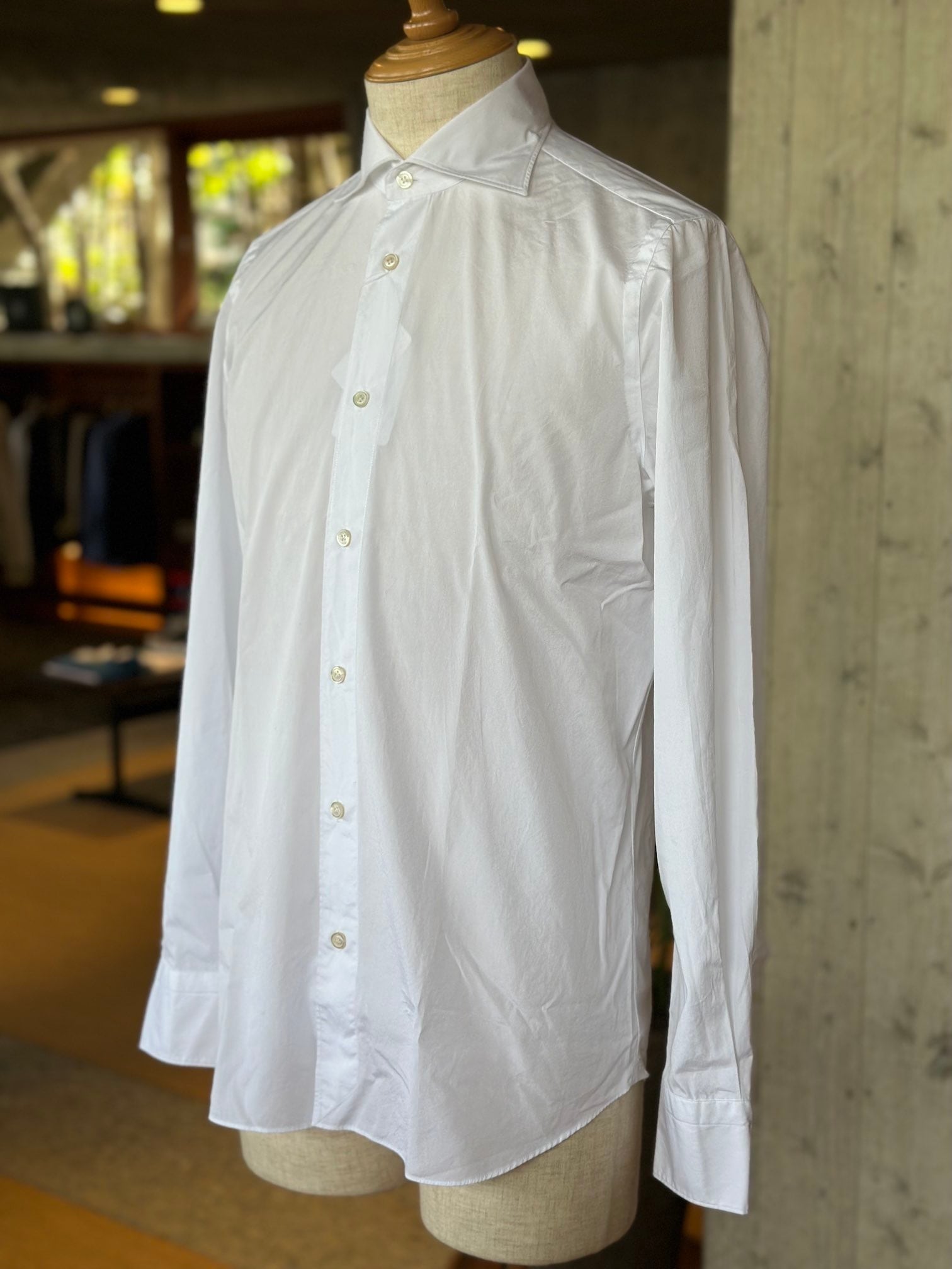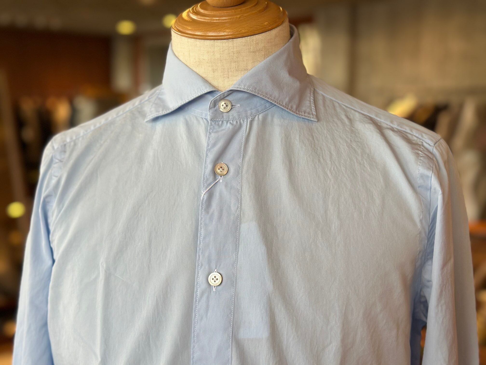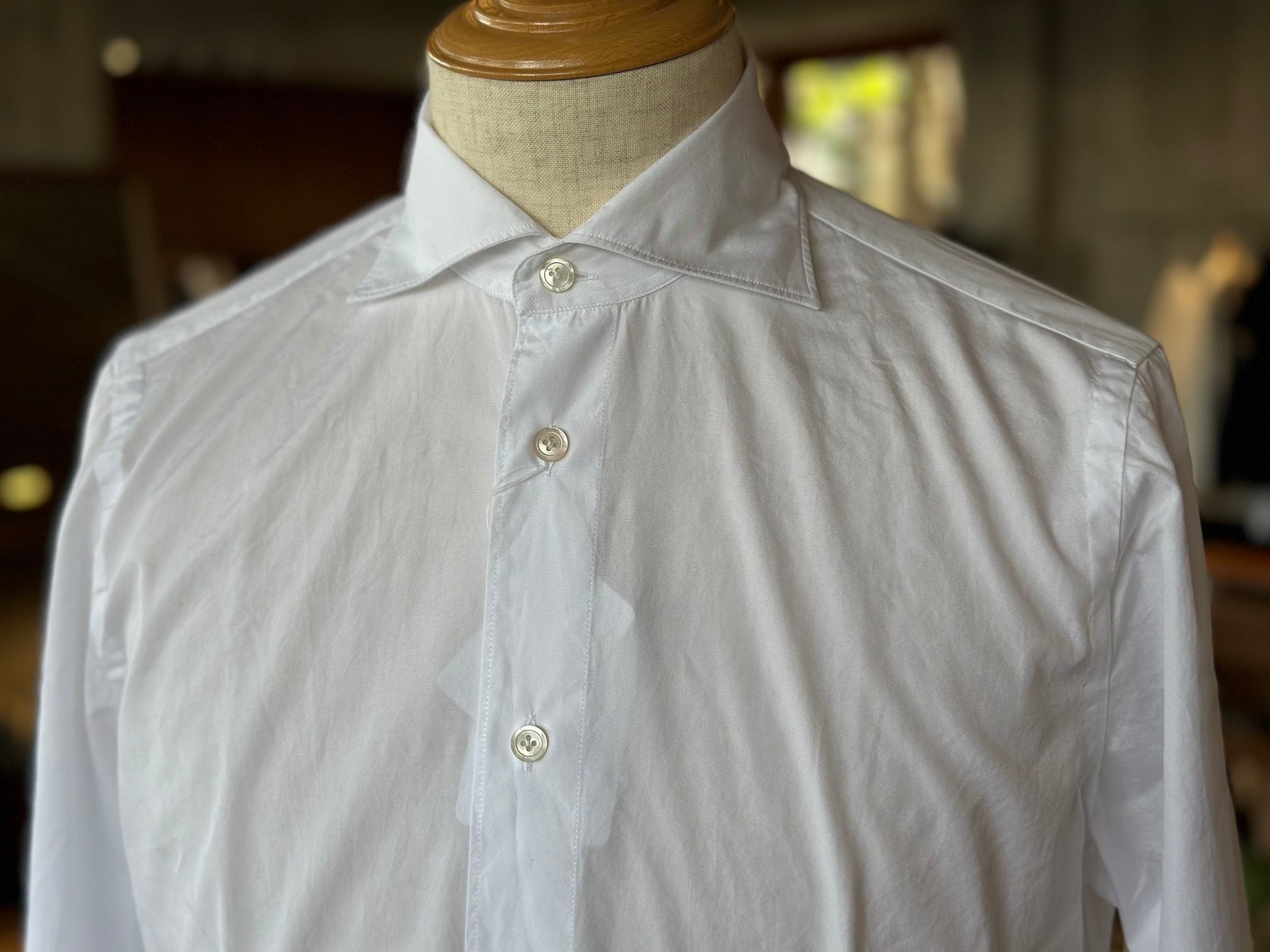 Finamoreを代表する襟型「SIMONE(シモーネ)」を採用。開きすぎず、詰まりすぎない絶妙なバランスで、ネクタイの有無を問わず違和感なく取り入れられる、汎用性の高い襟型です。