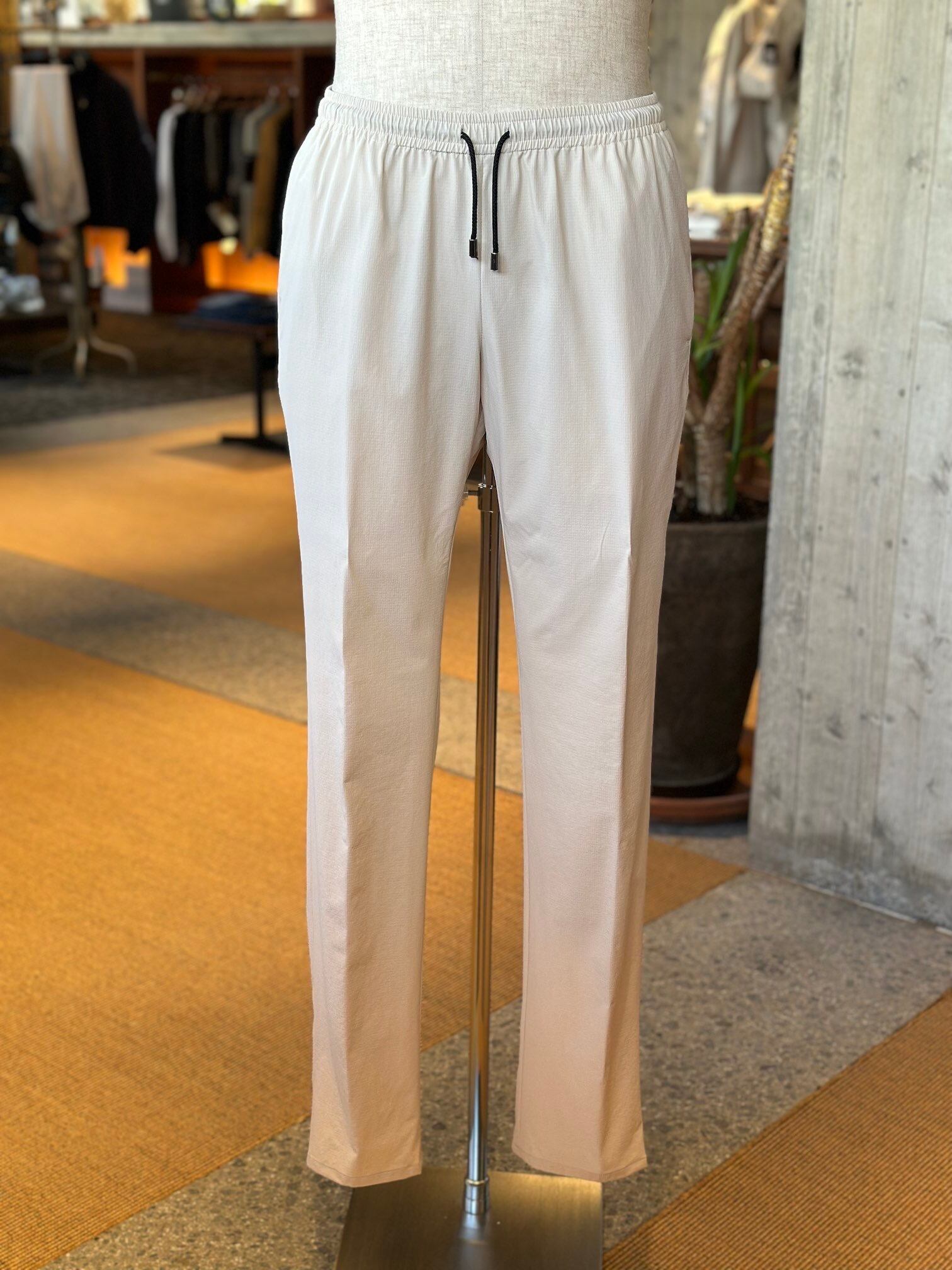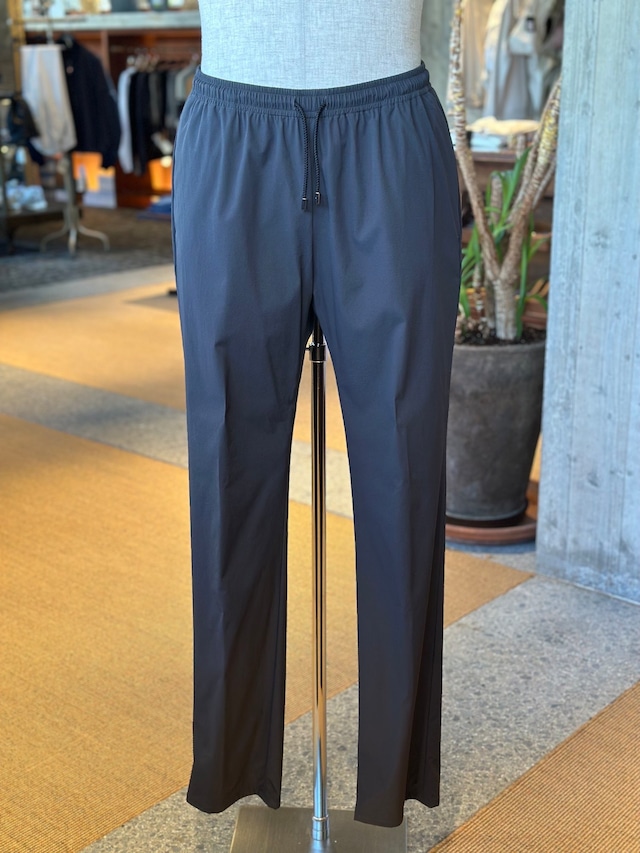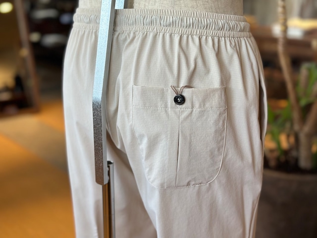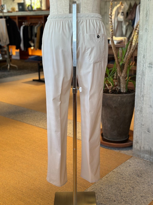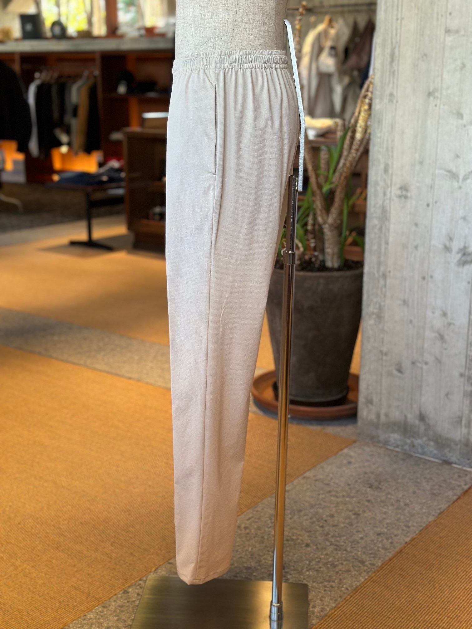 ジャブスアルキヴィオが提案する新しいリラクシングパンツ。驚愕の軽さとウエストの総ゴムシャーリング仕様で窮屈感から解き放ち、得意のイタリア仕立てのスリムシルエットでエレガントさを失いません。