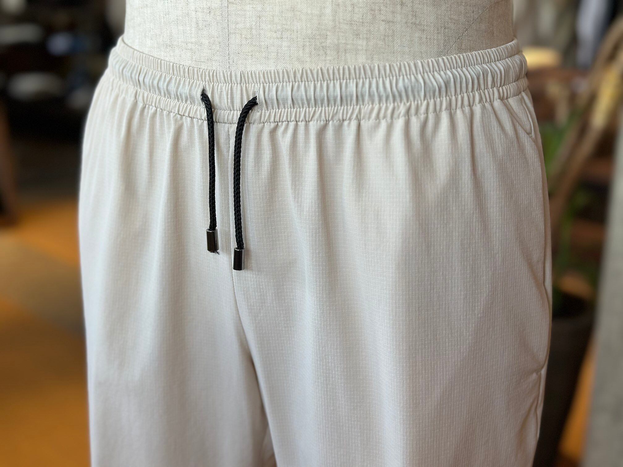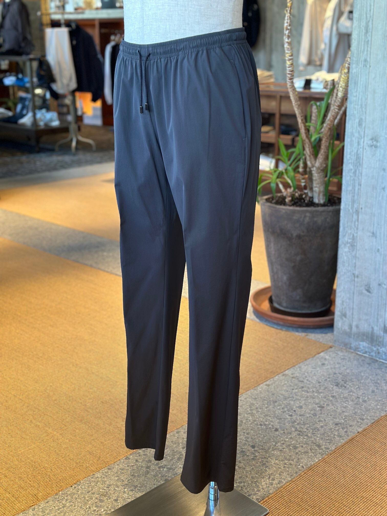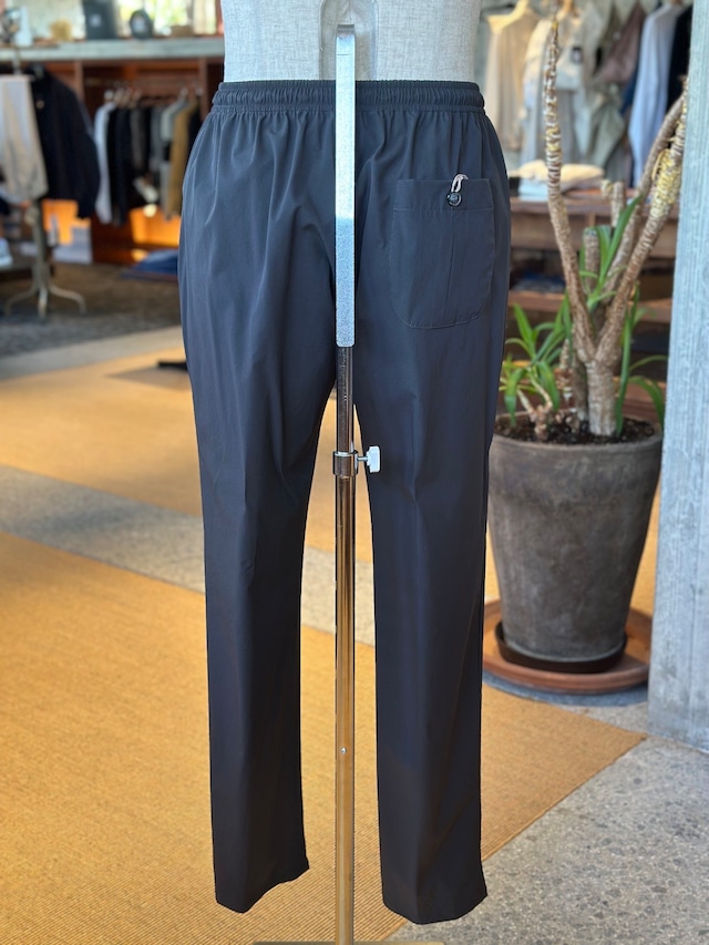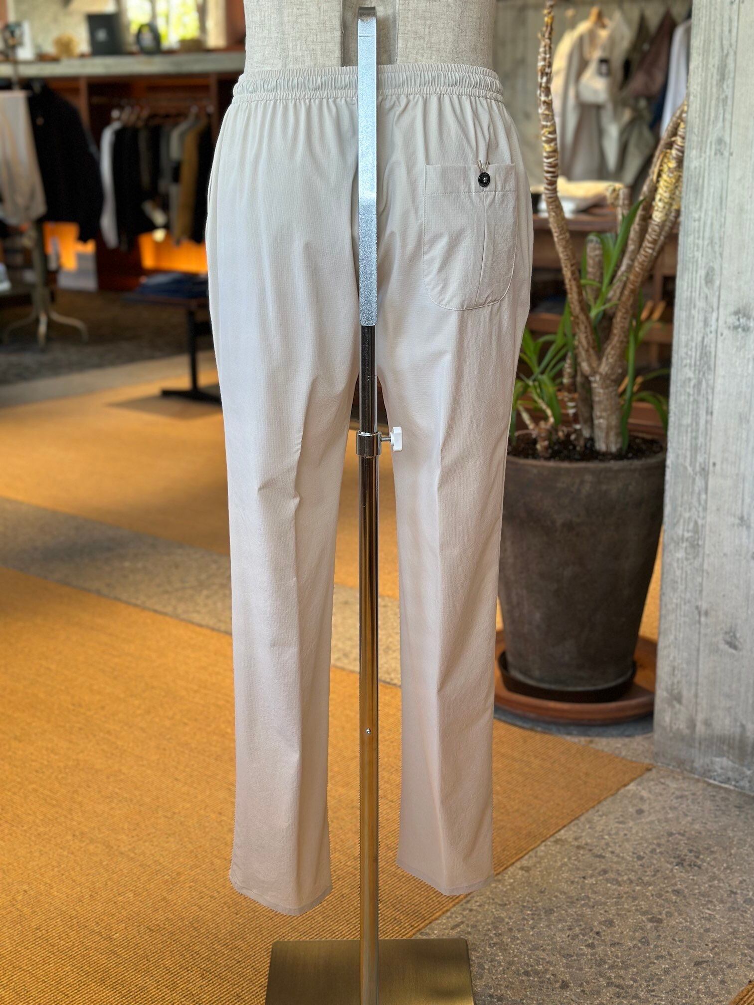 ジャブスアルキヴィオが提案する新しいリラクシングパンツ。驚愕の軽さとウエストの総ゴムシャーリング仕様で窮屈感から解き放ち、得意のイタリア仕立てのスリムシルエットでエレガントさを失いません。