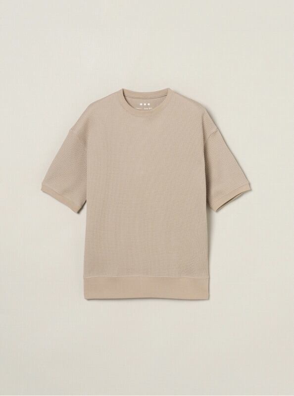 やや太番手の双糸を使用することで、しっかりとした程よい肉感を持ちながら、触れた瞬間にやさしく包み込まれるような柔らかな肌ざわりを実現しました。自然な凹凸のあるワッフル編みが空気を含み、快適な着心地に。