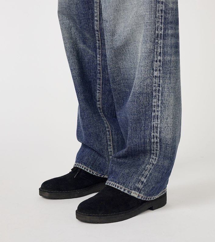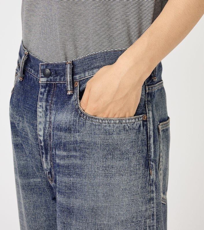 ・旧式のシャトル織機で空気を含みながらゆっくり織り上げたデニムは、生地の目が詰まらず凹凸感のある風合いで、穿いていくごとに体に馴染み、セルビッチデニム独特の色落ちが特徴。