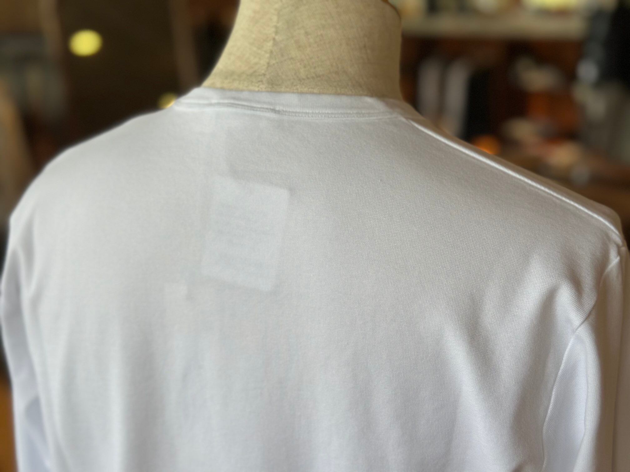 首回りには、綺麗にエレガントに映るよう細い二本針でバインドされ、リラックスした雰囲気の中にも気品を感じさせます。