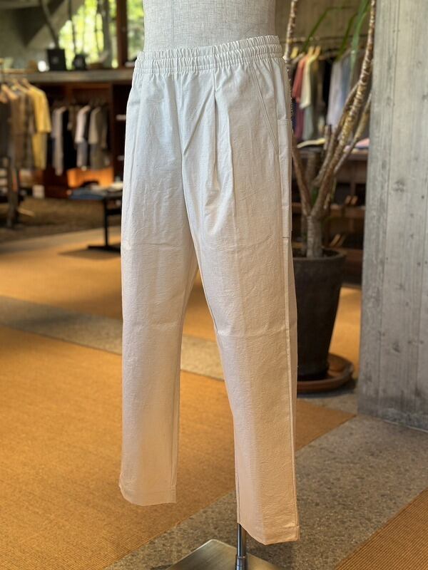 乾燥感のあるアメリカ、オーストラリアの混合綿を使用、その原綿をカーディングする際、機械の調整でネップを作り、レピア織機で糸に強度を加えながら織ることで生地自体の強度を高めたバックネップ素材を使用したBNアンプスパンツです。このバックネップ素材は表面に上品さを出すためシルケット加工をせず染色、ネップの凹凸を残しながら自然で上品な表情に仕上げました。またハリコシを出すために樹脂で硬仕上げを施し防風性の向上と洗濯による形状変化を抑える加工を加えました。デザインはBaseballの球審の腰回りのシルエットを参考にスペアボールを入れていたような大きめのマチ付きポケットを配しました。腰回りはゆったりとしながらも裾にかけて強めのテーパーですっきり見える設計です。ウエストはゴムとコードで調節が可能です。